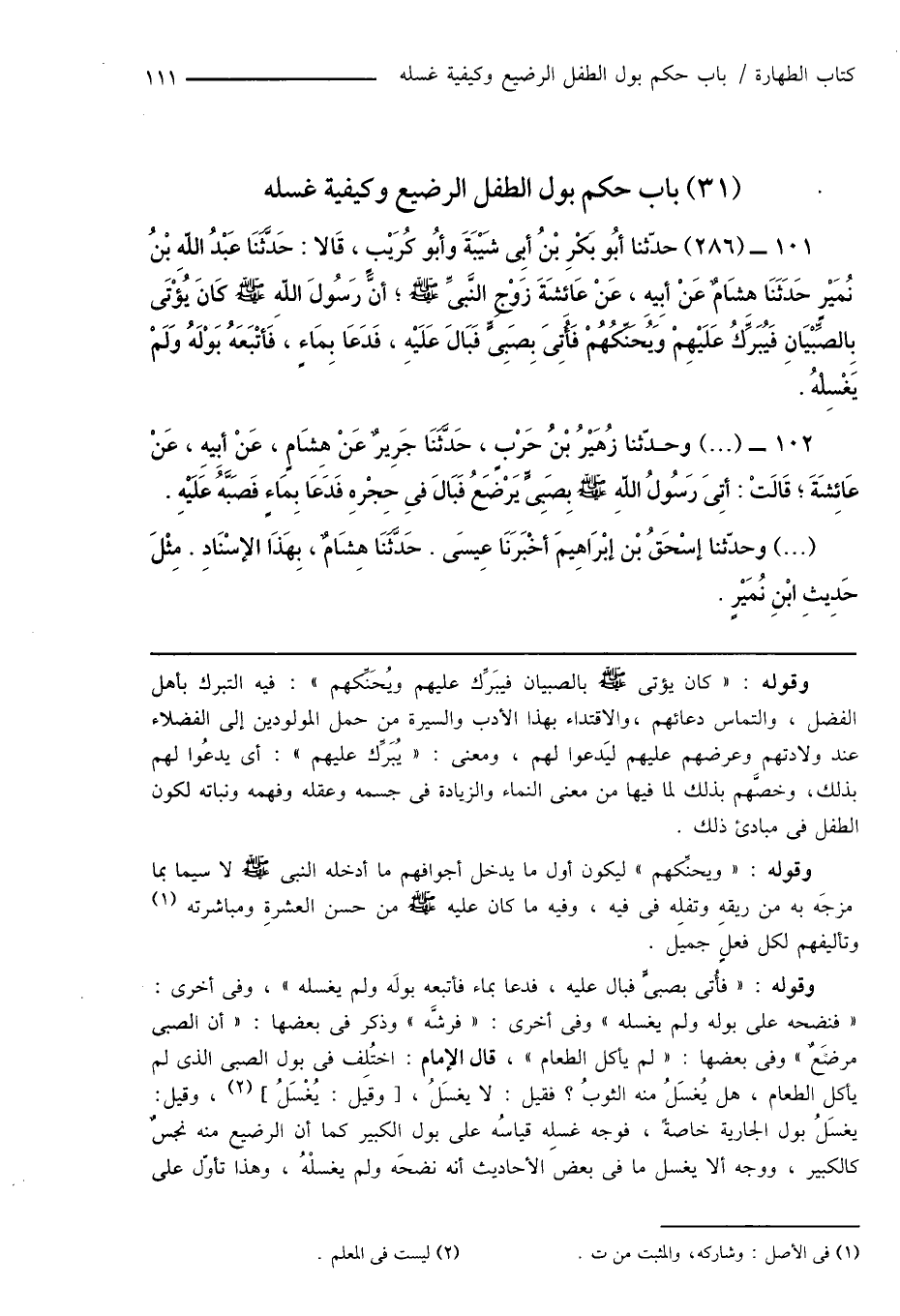 101 - (286) حدّثنا أَبُو بَكْرِ بْنُ أَبِى شَيْبَةَ وأبُو كُرَيْبٍ، قَالا: حَدَّثَنَا عَبْدُ اللهِ بْنُ نُمَيْرٍ حَدَّثَنَا هِشَامٌ عَنْ أَبِيهِ، عَنْ عَائِشَةَ زَوْجِ النَّبِىِّ صَلَّى اللهُ عَلَيْهِ وَسَلَّمَ؛ أَنَّ رَسُولَ اللهِ صَلَّى اللهُ عَلَيْهِ وَسَلَّمَ كَانَ يُؤْتَى بِالصِّبْيَانِ فَيُبَرِّكُ عَلَيْهِمْ وَيُحَنِّكُهُمْ فَأُتِىَ بِصَبِىٍّ فَبَالَ عَلَيْهِ، فَدَعَا بِمَاءٍ، فَأتبَعَهُ بَوْلَهُ وَلَمْ يَغْسِلْهُ.