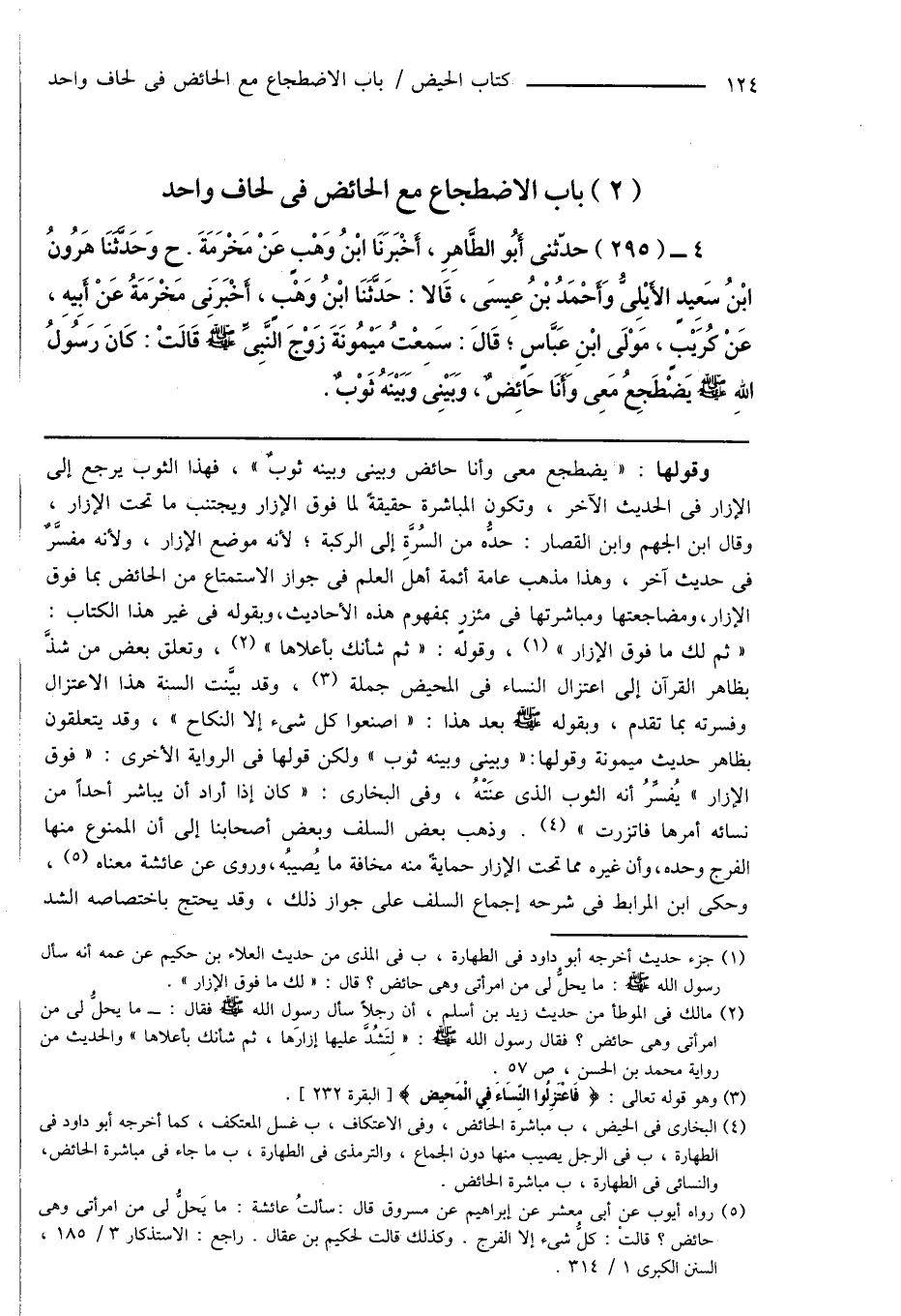 (¬2) مالك فى الموطأ من حديث زيد بن أسلم، أن رجلاً سأل رسول الله صَلَّى اللهُ عَلَيْهِ وَسَلَّمَ فقال: ما يحلُّ لى من امرأتى وهى حائض؟ فقال رسول الله صَلَّى اللهُ عَلَيْهِ وَسَلَّمَ: " لِتَشُدَّ عليها إزارَها، ثم شأنك بأعلاها " والحديث من رواية محمد بن الحسن، ص 57.