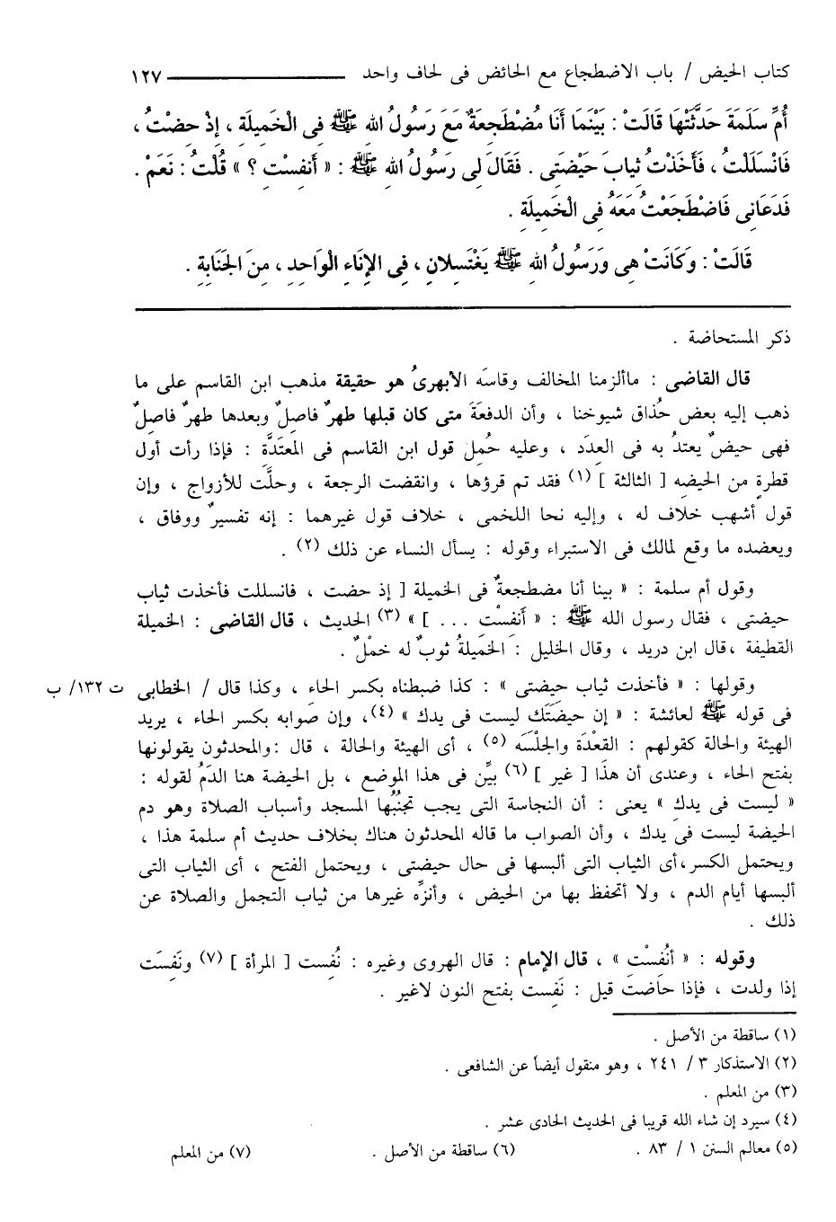 أُمِّ سَلَمَةَ حَدَّثَتْهَا قَالَتْ: بَيْنَمَا أَنَا مُضْطَجِعَةٌ مَعِ رَسُولُ اللهِ صَلَّى اللهُ عَلَيْهِ وَسَلَّمَ فِى الْخَمِيلَةِ، إِذْ حِضْتُ، فَانْسَلَلْتُ، فَأَخَذْتُ ثِيابَ حَيْضَتِى. فَقَالَ لِى رسُولُ اللهِ صَلَّى اللهُ عَلَيْهِ وَسَلَّمَ: " أَنفِسْتِ؟ " قُلتُ: نَعَمْ. فَدَعَانِى فَاضْطَجَعْتُ مَعَهُ فِى الْخَمِيلَةِ.