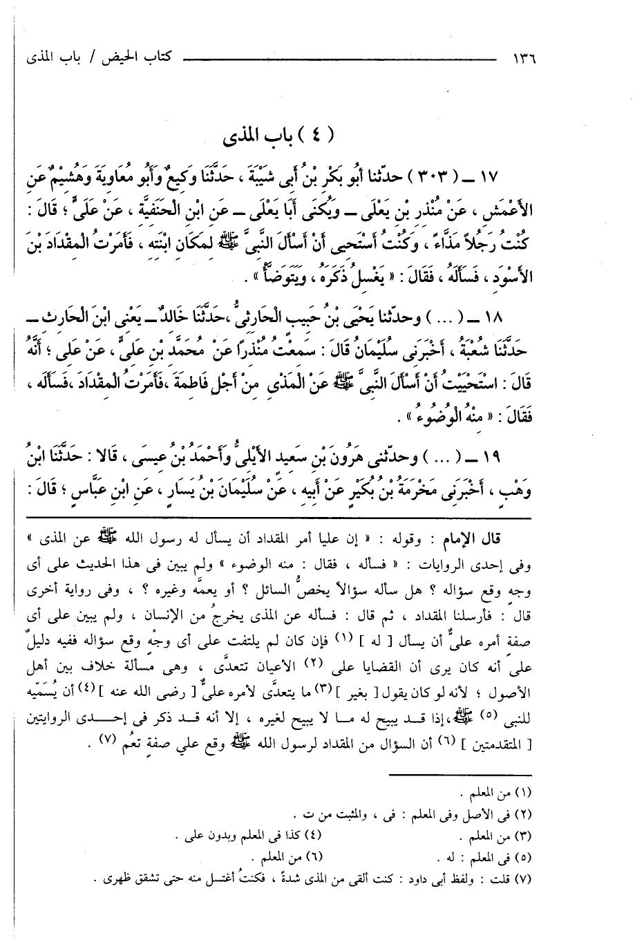 18 - (...) وحدّثنا يَحْيَى بْنُ حَبِيبٍ الْحَارِثِىُّ، حَدَّثَنَا خَالِدٌ - يَعْنِى ابْنَ الْحَارِثِ - حَدَّثَنَا شُعْبَةُ، أَخْبَرَنِى سُلَيْمَانُ قَالَ: سَمِعْتُ مُنْذِرًا عَنْ مُحَمَّدِ بْنِ عَلِىٍّ، عَنْ عَلِى؛ أَنَّهُ قَالَ: اسْتَحْيَيْتُ أَنْ أَسْأَلَ النَّبِىَّ صَلَّى اللهُ عَلَيْهِ وَسَلَّمَ عَنْ الْمَذْىِ مِنْ أَجْل فَاطِمَةَ، فَأَمَرْتُ الْمِقْدَادَ، فَسَأَلَهُ، فَقَالَ: " مِنْهُ الْوُضُوءُ ".