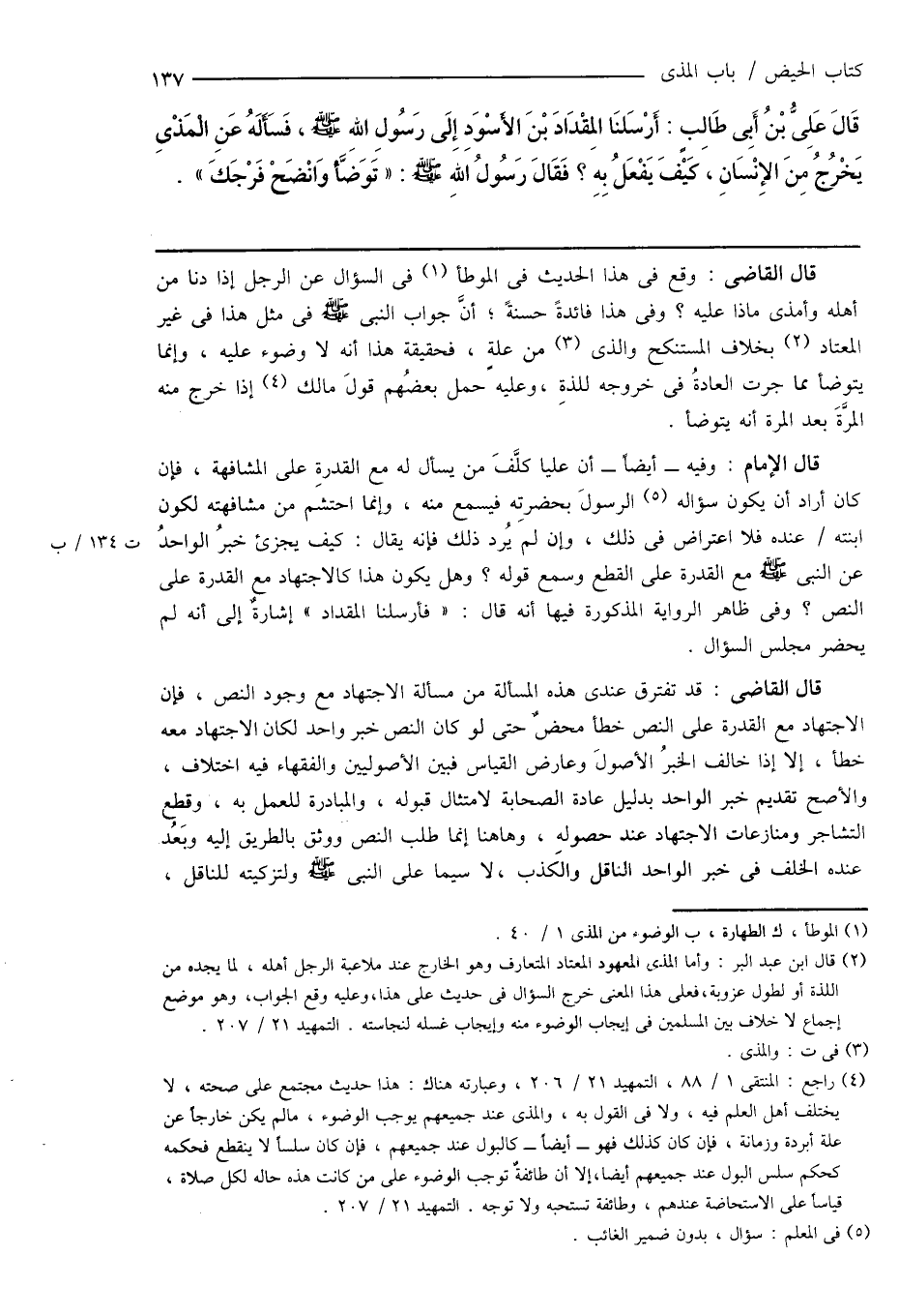 (¬4) راجع: المنتقى 1/ 88، التمهيد 21/ 206، وعبارته هناك: هذا حديث مجتمع على صحته، لا يختلف أهل العلم فيه، ولا فى القول به، والمذى عند جميعهم يوجب الوضوء، ما لم يكن خارجاً عن علة أبردة وزمانة، فإن كان كذلك فهو - أيضاً - كالبول عند جميعهم، فإن كان سلساً لا ينقطع فحكمه كحكم سلس البول عند جميعهم أيضاً، إِلا أن طائفة توجب الوضوء على من كانت هذه حاله لكل صلاة، قياساً على الاستحاضة عندهم، وطائفة تستحبه ولا توجبه. التمهيد 21/ 207.