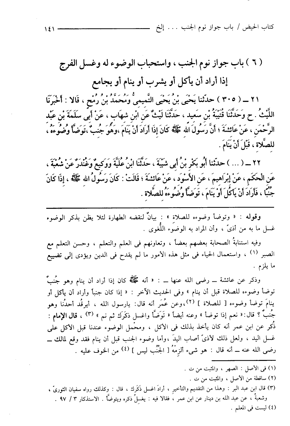 21 - (305) حدّثنا يَحْيَى بْنُ يَحْيَى التَّمِيمِىُّ وَمُحَمَّدُ بْنُ رُمْحٍ، قَالا: أَخْبَرَنَا اللَّيْثُ. ح وَحَدَّثَنَا قُتَيْبَةُ بْنِ سَعِيدٍ، حَدَّثَنَا لَيْثٌ عَنِ ابْنِ شِهَابٍ، عَنْ أَبِى سَلَمَةَ بْنِ عَبْدِ الرَّحْمَنِ، عَنْ عَائِشَةَ؛ أَنَّ رَسُولَ اللهِ صَلَّى اللهُ عَلَيْهِ وَسَلَّمَ كَانَ إِذَا أَرَادَ أَنْ يَنَامَ، وَهُوَ جُنبٌ، تَوَضَّأَ وُضُوءَهُ، للِصَّلاةِ، قَبْلَ أَنْ يَنَامَ.