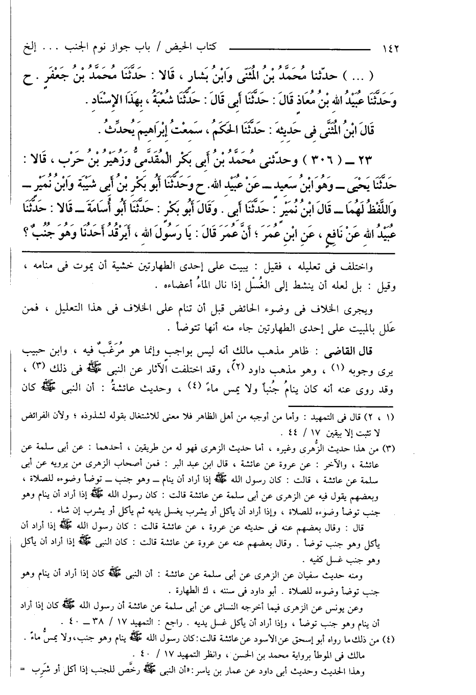 (¬4) من ذلك ما رواه أبو إسحاق عن الأسود عن عائشة قالت: كان رسول الله صَلَّى اللهُ عَلَيْهِ وَسَلَّمَ ينام وهو جنب، ولا يمسُّ ماءً. مالك فى الموطأ برواية محمد بن الحسن، وانظر التمهيد 17/ 40.