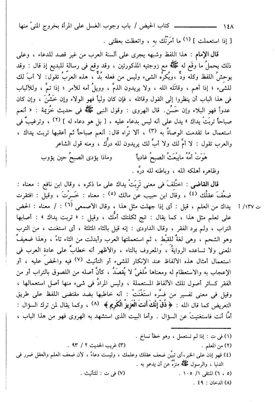 قال القاضى: اختُلِفَ فى معنى تَرِبَتْ يداك على ما ذكره، وقال ابن نافع: معناه: ضعُفَ عقلُك (¬4)، وقال ابن حبيب عن مالك (¬5): معناه: خَسِرْتَ، وقيل: افتقرت يداك من العلم، قيل: أى إذا جهلت مثل هذا، وقال الأصمعى (¬6): معناه: الحض على تعلم مثل هذا، كما يقال: انج ثكلتك أمُّك، وقيل: " تربت يداك ": أصابها التراب، ولم يرد الفقر، وقال الداودى: إنه قيل بالثاء المثلثة، أى استغنت، من الترب وهو الشحم، وهى لغةٌ للِقبْطِ، ثم استعملتها العرب وأبدلت من الثاء تاءً، وهذا ضعيفُ المعنى ولا تساعده الروايةُ، وَالمعروف بالتاء، والأظهر أنه خطابٌ على عادةِ العرب فى استعمال أمثال هذه الألفاظ عند الإنكار للشىء أو التأنيث (¬7) فيه والحض عليه، أو الإعجاب به والاستعظام له ومعناها مُلغىً لا يُقصَدُ، كأنَّ أصله من اللصوق بالتراب أو من الفقر كسائر أصول تلك الألفاظ المستعملة، وليس المرادُ فى شىء منها أصل استعمالها، وقيل فى معنى تفسير من فسَّره استَغْنَتْ: أنه خاطبها بضد مقتضى اللفظ على طريق التعريض كما قال الله: {ذُقْ إِنَّكَ أَنتَ الْعَزِيزُ الْكَرِيم} (¬8)، وكما يقال لمن ترك السؤال: أَمَّا أنت فاستغنيتَ عن السؤال. وأما البيت الذى استشهد به الهروى فهو من هذا الباب،