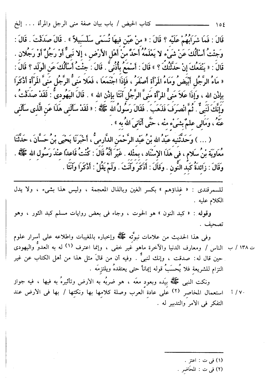 (...) وَحَدَّثَنِيهِ عَبْدُ اللهِ بْنُ عَبْدِ الرَّحْمَنِ الدَّارِمِىُّ، أَخْبَرَنَا يَحْيَى بْنُ حَسَّانَ، حَدَّثَنَا مُعَاويَة بْنُ سَلامٍ، فِى هَذَا الإِسْنَادِ، بِمِثْلِهِ. غَيْرَ أَنَّهُ قَالَ: كُنْتُ قَاعِدًا عِنْدَ رَسُولِ اللهِ صَلَّى اللهُ عَلَيْهِ وَسَلَّمَ. وَقَالَ: زَائِدَةُ كَبِدِ النُّونِ. وَقَالَ: أَذَكَرَ وَآنَثَ. وَلَمْ يَقُلْ: أَذكَرَا وَآنَثَا.