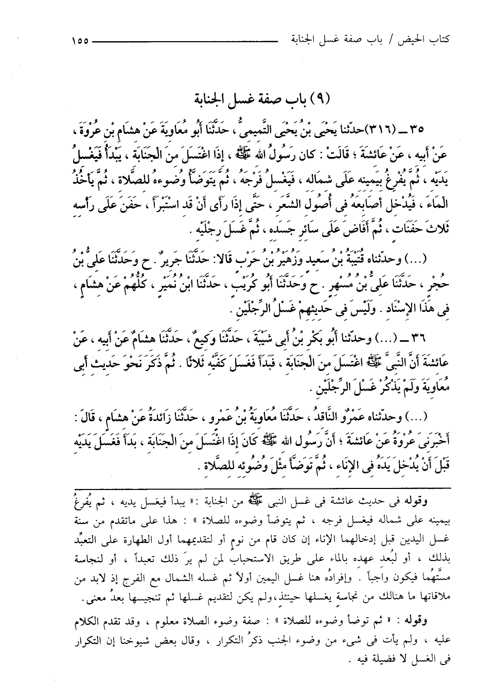 36 - (...) وحدّثنا أَبُو بَكْرِ بْنُ أَبِى شَيْبَةَ، حَدَّثَنَا وَكِيعٌ، حَدَّثَنَا هِشَامٌ عَنْ أَبِيهِ، عَنْ عَائِشَةَ أَنَّ النَّبِىَّ صَلَّى اللهُ عَلَيْهِ وَسَلَّمَ اغْتَسَلَ مِنَ الْجَنَابَةِ، فَبَدَأَ فَغَسَلَ كَفَّيْهِ ثَلاثًا. ثُمَّ ذَكَرَ نَحْوَ حَدِيث أَبِى مُعَاوِيَةَ وَلَمْ يَذْكُرْ غَسْلَ الرِّجْلَيْنِ.