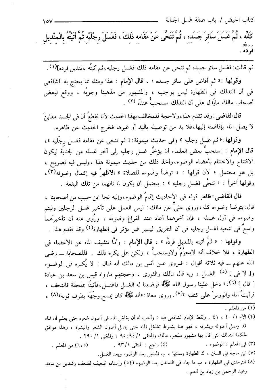 قال القاضى. ظاهر قوله فى الأحاديث إتمامُ الوضوء، وإليه نحا ابن حبيب من أصحابنا، قال: يتوضأ وضوءه كله، وروى علىٌّ عن مالك: ليس العمل على تأخير غسل الرجلين وليتم وضوءه فى أول غسله، فإن أخرهما أعاد عند الفراغ وضوءَه، ورُوى عنه أن تأخيرَهما واسعٌ فى تنحيه لغسل رجليه فى أن التفريق اليسير غير مؤثر فى الطهارة (¬4) وقد تقدم هذا.