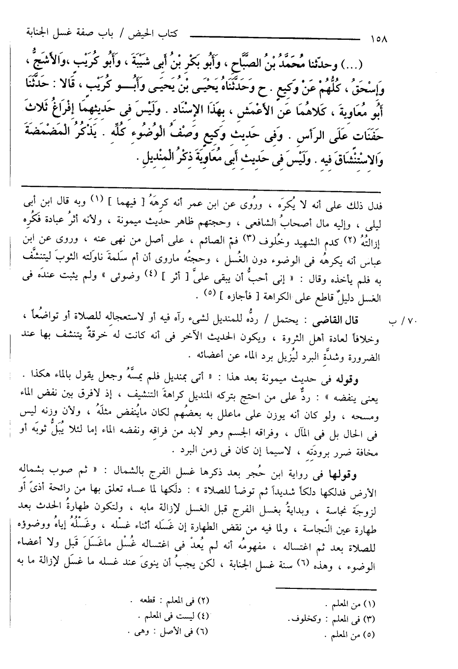 وقوله فى حديث ميمونة بعد هذا: " أتى بمنديل فلم يمسَّهُ وجعل يقول بالماء هكذا. يعنى ينفضه ": ردٌّ على من احتج بتركه المنديل كراهةَ التنشيف، إذ لا فرق بين نفض الماء ومسحه، ولو كان أنه يوزن على ما علل به بعضُهم لكان ما يُنفض مثلَهُ، ولأن وزنه ليس فى الحال بل فى المآل، وفراقه الجسم وهو لابد من فراقِه ونفضه الماء إما لئلا يُبَلُّ ثوبَه أو مخافة ضرر برودَتِهِ، لا سيما إن كان فى زمن البرد.