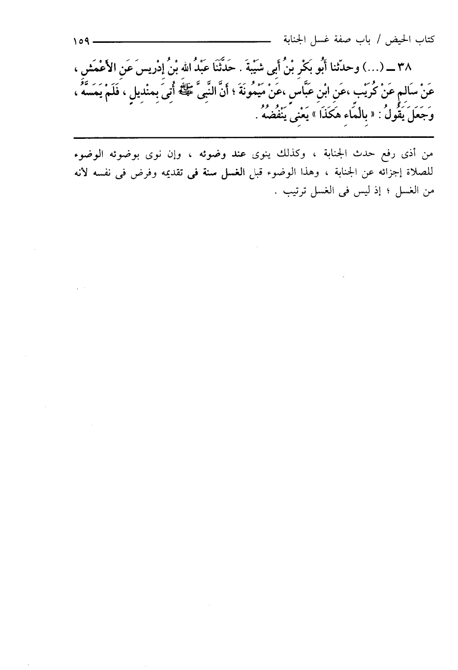 38 - (...) وحدّثنا أَبُو بَكْرِ بْنُ أَبِى شَيْبةَ. حَدَّثَنَا عَبْدُ اللهِ بْنُ إِدْرِيسَ عَنِ الأَعْمَشِ، عَنْ سَالِمٍ عَنْ كُرَيْبٍ، عَنِ ابْنِ عَبَّاسٍ، عَنْ مَيْمُونَةَ؛ أَنَّ النَّبِىَّ صَلَّى اللهُ عَلَيْهِ وَسَلَّمَ أُتِىَ بِمنْدِيلٍ، فَلَمْ يَمَسَّهُ، وَجَعَلَ يَقولُ: " بِالْمَاءِ هَكَذَا " يَعْنِى يَنْفُضُهُ.