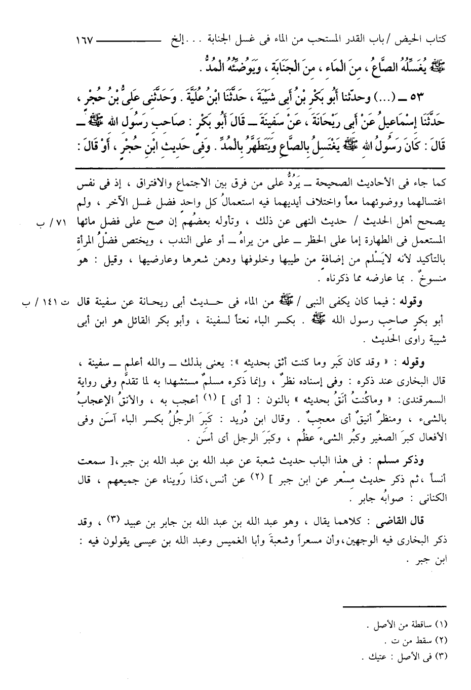 53 - (...) وحدّثنا أَبُو بَكْرِ بْنُ أَبِى شَيْبَةَ، حَدَّثَنَا ابْنُ عُلَيَّةَ. وَحَدَّثَنِى عَلِىُّ بْنُ حُجْرٍ، حَدَّثَنَا إِسْمَاعِيلُ عَنْ أَبِى رَيْحَانَةَ، عَنْ سَفِينَةَ - قَالَ أَبُو بَكْرٍ: صَاحِبِ رَسُولِ اللهِ صَلَّى اللهُ عَلَيْهِ وَسَلَّمَ - قَالَ: كَانَ رَسُولُ اللهِ صَلَّى اللهُ عَلَيْهِ وَسَلَّمَ يَغْتَسِلُ بِالصَّاعِ وَيَتَطَهَّرُ بِالْمُدِّ. وَفِى حَدِيثِ ابْنِ حُجْرٍ، أَوْ قَالَ: