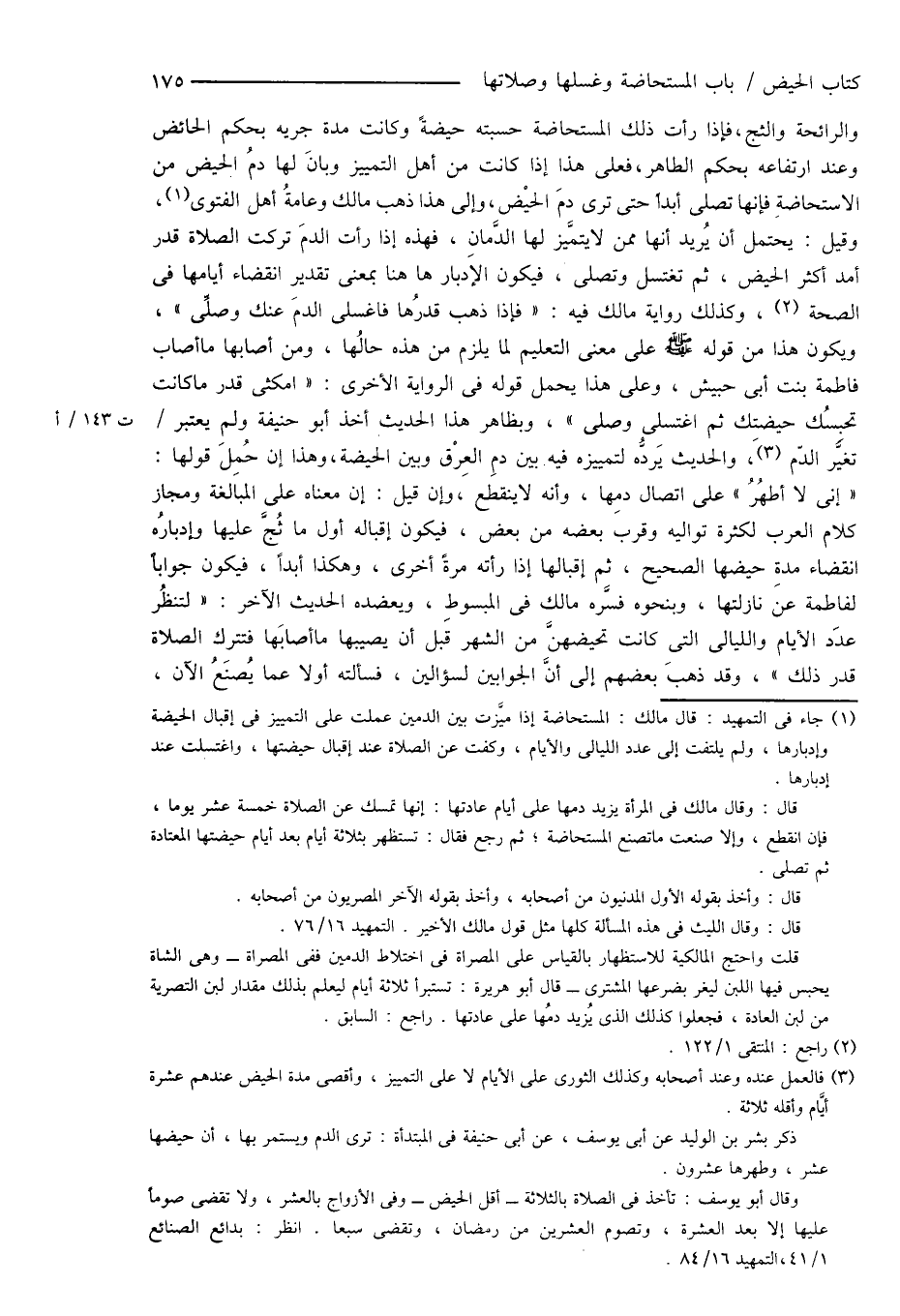 (¬1) جاء فى التمهيد: قال مالك: المستحاضة إذا ميَّزت بين الدمين عملت على التمييز فى إقبال الحيضة وإدبارها، ولم يلتفت إلى عدد الليالى والأيام، وكفت عن الصلاة عند إقبال حيضتها، واغتسلت عند إدبارها.