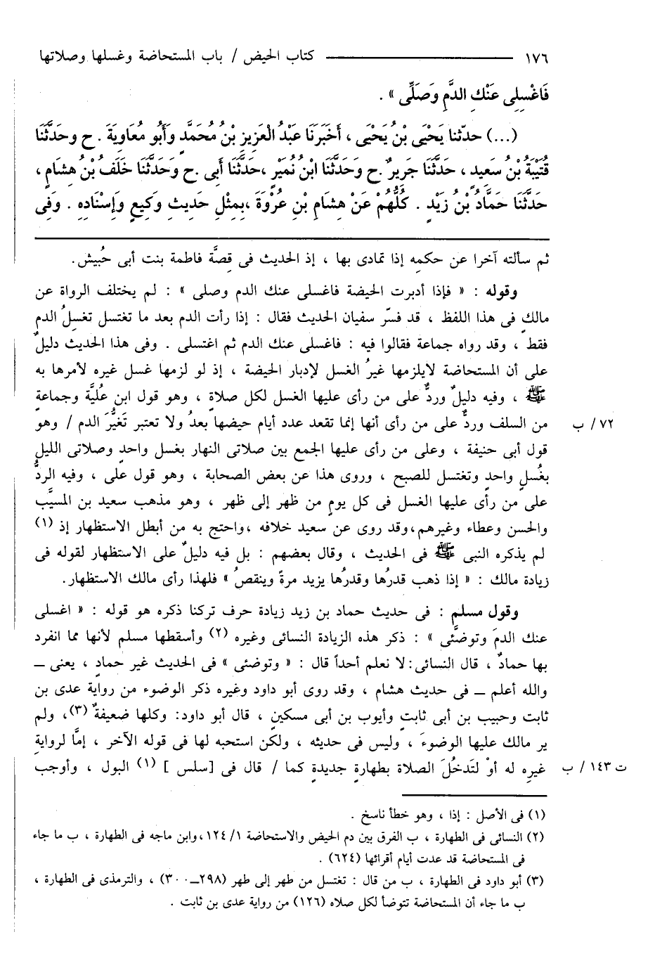 (¬3) أبو داود فى الطهارة، ب من قال: تغتسل من طهر إلى طهر (298 - 300)، والترمذى فى الطهارة، ب ما جاء أن المستحاضة تتوضأ لكل صلاة (126) من رواية عدى بن ثابت.