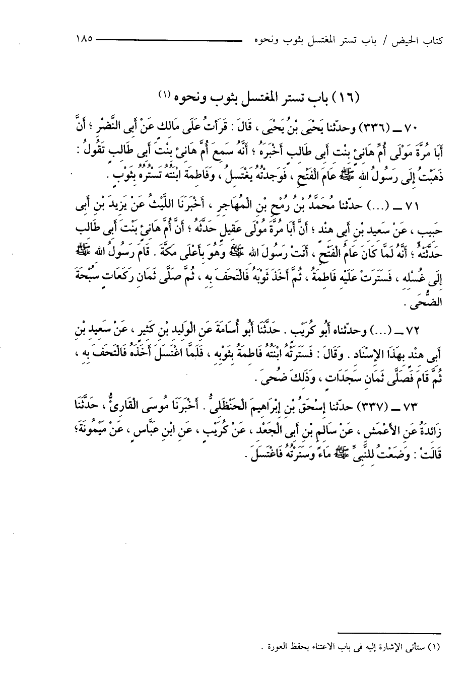 70 - (336) وحدّثنا يَحْيَى بْنُ يَحْيَى، قَالَ: قَرَأْتُ عَلَى مَالِكٍ عَنْ أَبِى النَّضْرِ؛ أَنَّ أَبَا مُرَّةَ مَوْلَى أُمِّ هَانِئٍ بِنْتِ أَبِى طَالِبٍ أَخْبَرَهُ؛ أَنَّهُ سَمِعَ أُمَّ هَانِئ بِنْتَ أَبِى طَالِبٍ تَقُولُ: ذَهَبْتُ إِلَى رَسُولُ اللهِ صَلَّى اللهُ عَلَيْهِ وَسَلَّمَ عَامَ الْفَتْحِ، فَوَجدْتُهُ يَغْتَسِلُ، وَفَاطِمَة ابْنَتُهُ تَسْتُرُهُ بِثَوْبٍ.