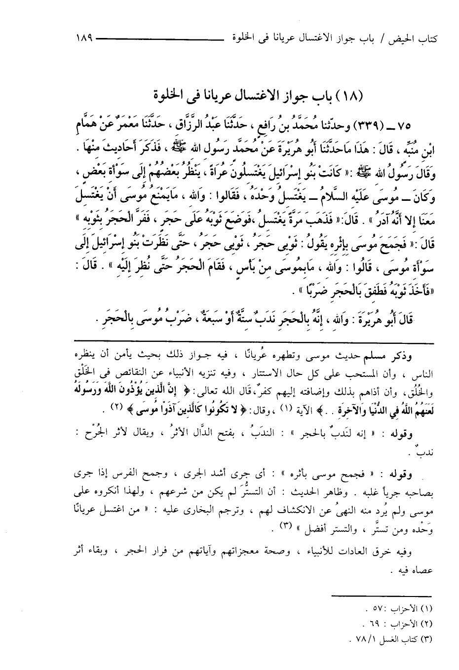 75 - (339) وحدّثنا مُحَمَّدُ بنُ رَافِعٍ، حَدَّثَنَا عَبْدُ الرَّزَاقِ، حَدَّثَنَا مَعْمَرٌ عَنْ هَمَّامِ ابْنِ مُنَبِّهٍ، قَالَ: هَذَا مَا حَدَّثَنَا أَبُو هُرَيْرَةَ عَنْ مُحَمَّدٍ رَسُولِ اللهِ صَلَّى اللهُ عَلَيْهِ وَسَلَّمَ، فَذَكَرَ أَحَادِيثَ مِنْهَا. وَقَالَ رَسُولُ اللهِ صَلَّى اللهُ عَلَيْهِ وَسَلَّمَ: " كَانَتْ بَنُو إِسْرَائِيلَ يَغْتَسِلُونَ عُرَاةً، يَنْظُرُ بَعْضُهُمْ إِلَى سَوْأةِ بَعْضٍ، وَكَانَ - مُوسَى عَلَيْهِ السَّلامُ - يَغْتَسِلُ وَحْدَهُ، فَقَالوا: وَاللهِ، مَا يَمْنَعُ مُوسَى أَنْ يَغْتَسِلَ مَعَنَا إِلا أَنَّهُ آدَرُ ". قَالَ: " فَذَهَبَ مَرَّةً يَغْتَسِلُ، فَوَضَعَ ثَوْبَهُ عَلَىَ حَجَرٍ، فَفَرَّ الْحَجَرُ بِثَوْبِهِ " قَالَ: " فَجَمَحَ مُوسَى بِإِثْرِهِ يَقُولُ: ثَوْبِى حَجَرُ، ثَوْبِى حَجَرُ، حَتَّى نَظَرَتْ بَنُو إِسْرَائِيلَ إِلَى سَوْأَةِ مُوسَى، قَالُوا: وَاللهِ، مَا بِمُوسَى مِنْ بَأْسٍ، فَقَامَ الْحَجَرُ حَتَّى نُظِرَ إِلَيْهِ ". قَالَ: " فَأَخَذَ ثَوْبَهُ فَطَفِقَ بَالْحَجَرِ ضَرْبًا ".