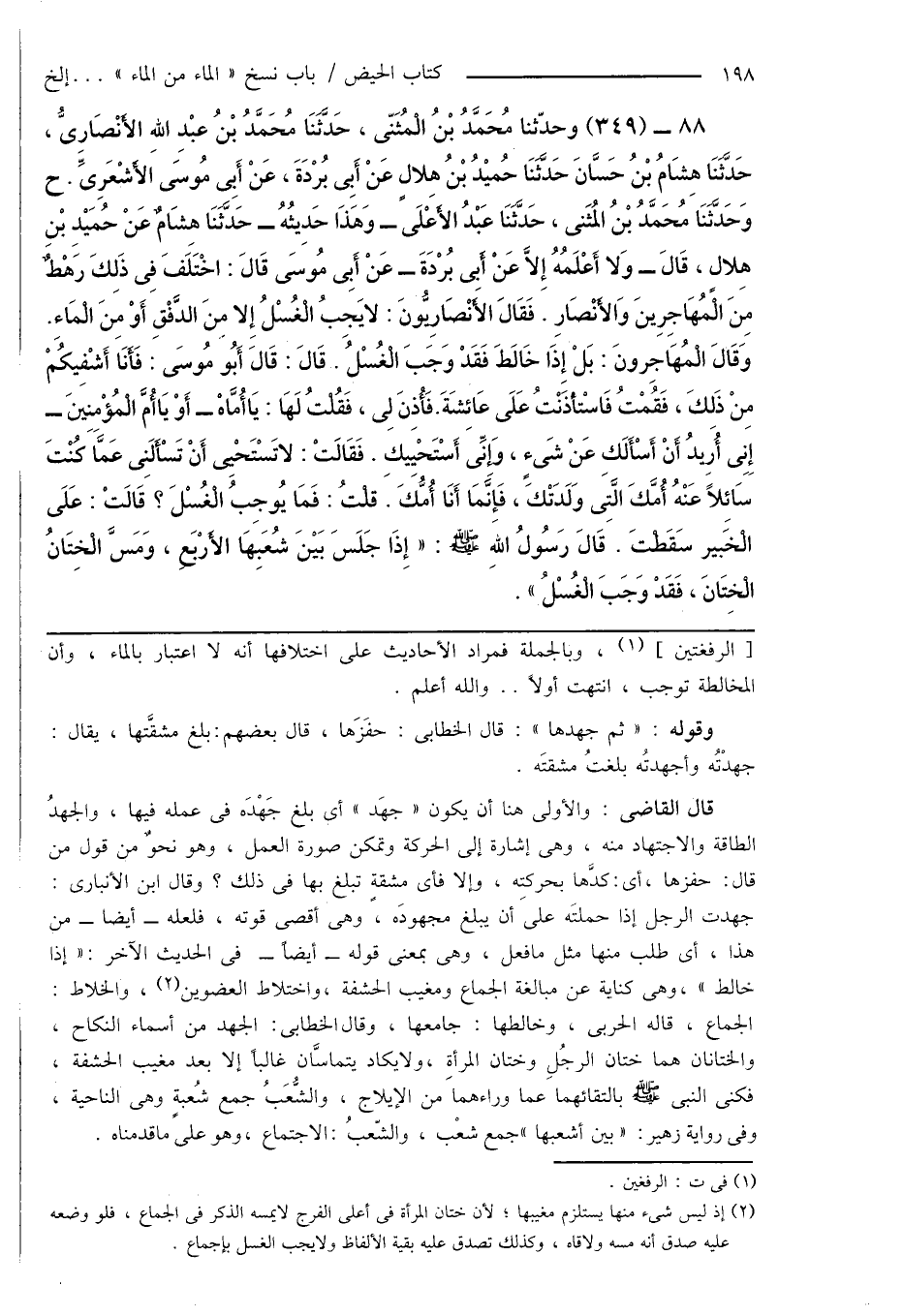 88 - (349) وحدّثنا مُحَمَّدُ بْنُ الْمُثَنَّى، حَدَّثَنَا مُحَمَّدُ بْنُ عبْدِ اللهِ الأَنْصَارِىُّ، حَدَّثَنَا هِشَامُ بْنُ حَسَّانَ حَدَّثَنَا حُميْدُ بْنُ هِلالٍ عَنْ أَبِى بُرْدَةَ، عَنْ أَبِى مُوسَى الأَشْعَرِىِّ. ح وَحَدَّثَنَا مُحَمَّدُ بْنُ المُثَنى، حَدَّثَنَا عَبْدُ الأَعْلَى - وَهَذَا حَدِيثُهُ - حَدَّثَنَا هِشَامٌ عَنْ حُمَيْدِ بْنِ هِلالٍ، قَالَ - وَلا أَعْلَمُهُ إِلَّا عَنْ أَبِى بُرْدَةَ - عَنْ أَبِى مُوسَى قَالَ: اخْتَلَفَ فِى ذَلِكَ رَهْطٌ مِنَ الْمُهَاجِرِينَ وَالأَنْصَارِ. فَقَالَ الأَنْصَارِيُونَ: لا يَجِبُ الْغُسْلُ إِلا مِنَ الدَّفْقِ أَوْ مِنَ الْمَاءِ. وَقَالَ الْمُهَاجِرُونَ: بَلْ إِذَا خَالَطَ فَقَدْ وَجَبَ الْغُسْلُ. قَالَ: قَالَ أَبُو مُوسَى: فَأَنَا أَشْفِيكُمْ مِنْ ذَلِكَ، فَقُمْتُ فَاسْتأْذَنْتُ عَلَى عَائِشَةَ. فَأُذِنَ لِى، فَقُلْتُ لَهَا: يَا أُمَّاهْ - أَوْ يَا أُمَّ الْمُؤْمِنِينَ - إِنِّى أُرَيدُ أَنْ أَسْأَلَكِ عَنْ شَىءٍ، وَإِنِّى أَسْتَحْيِيكِ. فَقَالَتْ: لا تَسْتَحْيِى أَنْ تَسْأَلَنِى عَمَّا كُنْتَ سَائِلاً عَنْهُ أُمَّكَ الَّتِى وَلَدَتْكَ، فَإِنَّمَا أَنَا أُمُّكَ. قلْتُ: فَمَا يُوجِبُ الْغُسْلَ؟ قَالَتْ: عَلَى الْخَبِير سَقَطْتَ. قَالَ رَسُولُ اللهِ صَلَّى اللهُ عَلَيْهِ وَسَلَّمَ: " إِذَا جَلَسَ بَيْنَ شُعَبِهَا الأَرْبَعِ، وَمَسَّ الْخِتَانُ الْخِتَانَ، فَقَدْ وَجَبَ الْغُسْلُ ".