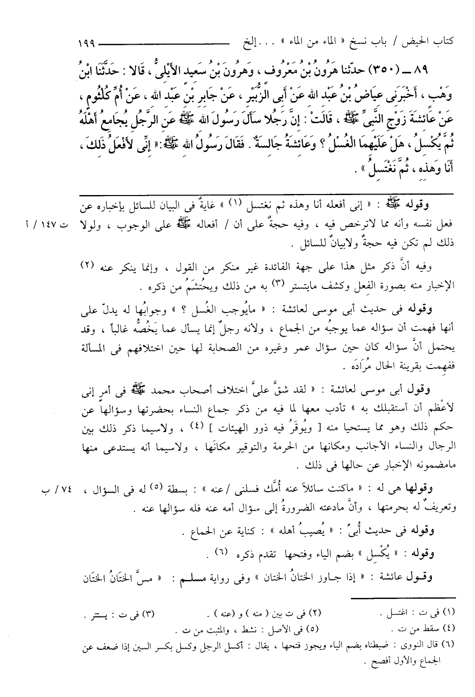 89 - (350) حدّثنا هَارُونُ بْنُ مَعْرُوفٍ، وَهَارُونَ بْنُ سَعِيدٍ الأَيْلِىُّ، قَالا: حَدَّثَنَا ابْنُ وَهْبٍ، أَخْبَرَنِى عِيَاضُ بْنُ عَبْدِ اللهِ عَنْ أَبِى الزُّبَيْرِ، عَنْ جَابِرِ بْنِ عَبْدِ اللهِ، عَنْ أُمِّ كُلْثُومٍ، عَنْ عَائِشَةَ زَوْجِ النَّبِىِّ صَلَّى اللهُ عَلَيْهِ وَسَلَّمَ، قَالَتْ: إِنَّ رَجُلاً سَأَلَ رَسُولَ اللهِ صَلَّى اللهُ عَلَيْهِ وَسَلَّمَ عَنِ الرَّجُلِ يُجَامِعُ أَهْلَهُ ثُمَّ يُكْسِلُ، هَلْ عَلَيْهِمَا الْغُسْلُ؟ وَعَائِشَةُ جَالِسَةٌ. فَقَالَ رَسُولُ اللهِ صَلَّى اللهُ عَلَيْهِ وَسَلَّمَ: " إِنِّى لأَفْعَلُ ذَلِكَ، أَنَا وَهذِهِ، ثُمَّ نَغْتَسِلُ ".