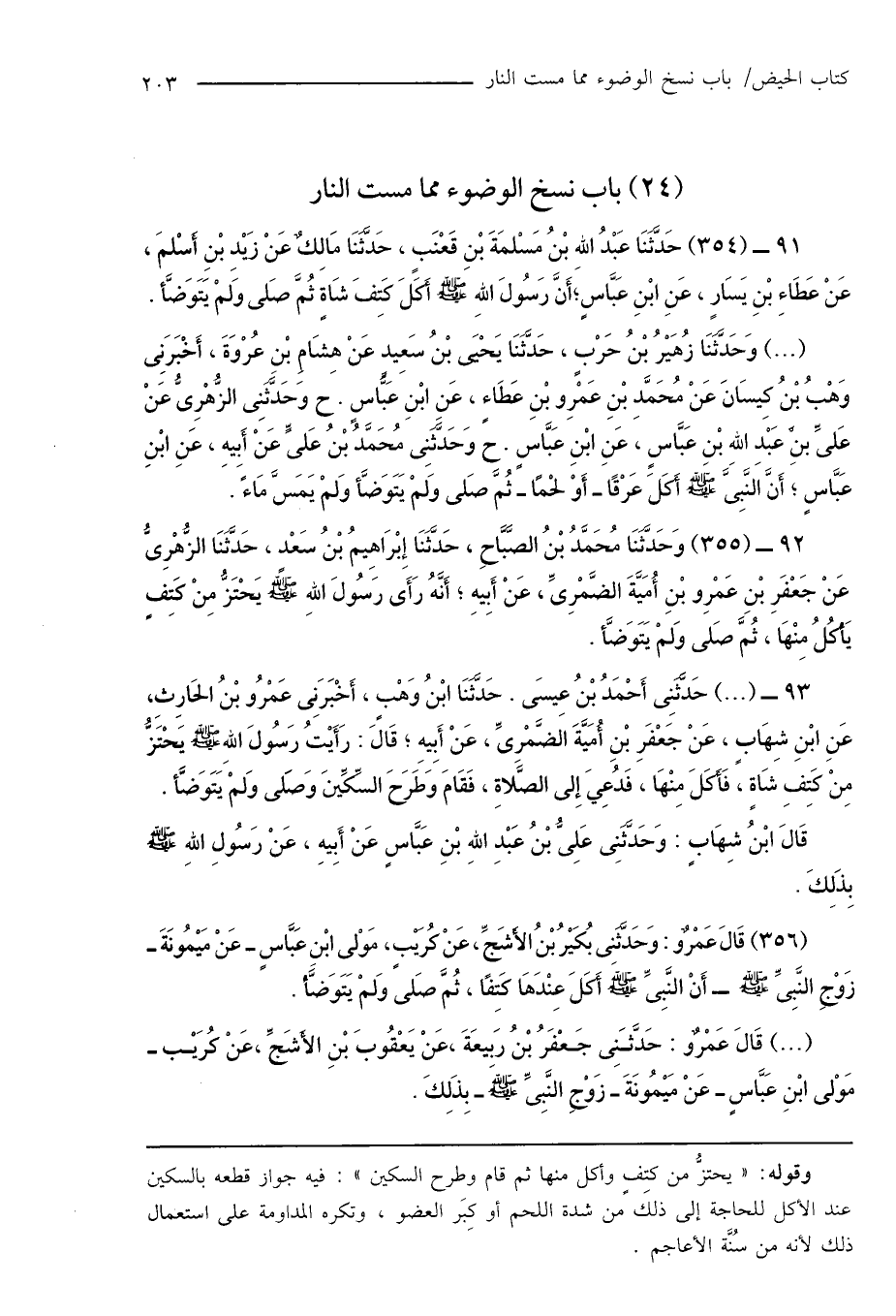 (...) وَحَدَّثَنَا زُهَيْرُ بْنُ حَرْبٍ، حَدَّثَنَا يَحْيَى بْنُ سَعِيد عَنْ هِشَامِ بْنِ عُرْوَةَ، أَخْبَرَنِى وَهْبُ بْنُ كِيسَانَ عَنْ مُحَمَّدِ بْنِ عَمْرِو بْنِ عَطَاءٍ، عَنِ ابْنِ عَبَّاسٍ. ح وحَدَّثَنِى الزُّهْرِىُّ عَنْ عَلىِّ بنِ عَبْدِ اللهِ بْنِ عَبَّاسٍ، عَنِ ابْنِ عَبَّاسٍ. ح وَحَدَّثَنِى مُحَمَّدُ بْنُ عَلىٍّ عَنْ أَبِيهِ، عَنِ ابْنِ عَبَّاسٍ؛ أَنَّ النَّبِىَّ صَلَّى اللهُ عَلَيْهِ وَسَلَّمَ أَكَلَ عَرْقًا - أَوْ لحْمًا - ثُمَّ صَلى وَلمْ يَتَوَضَّأ وَلمْ يَمَسَّ مَاءً.