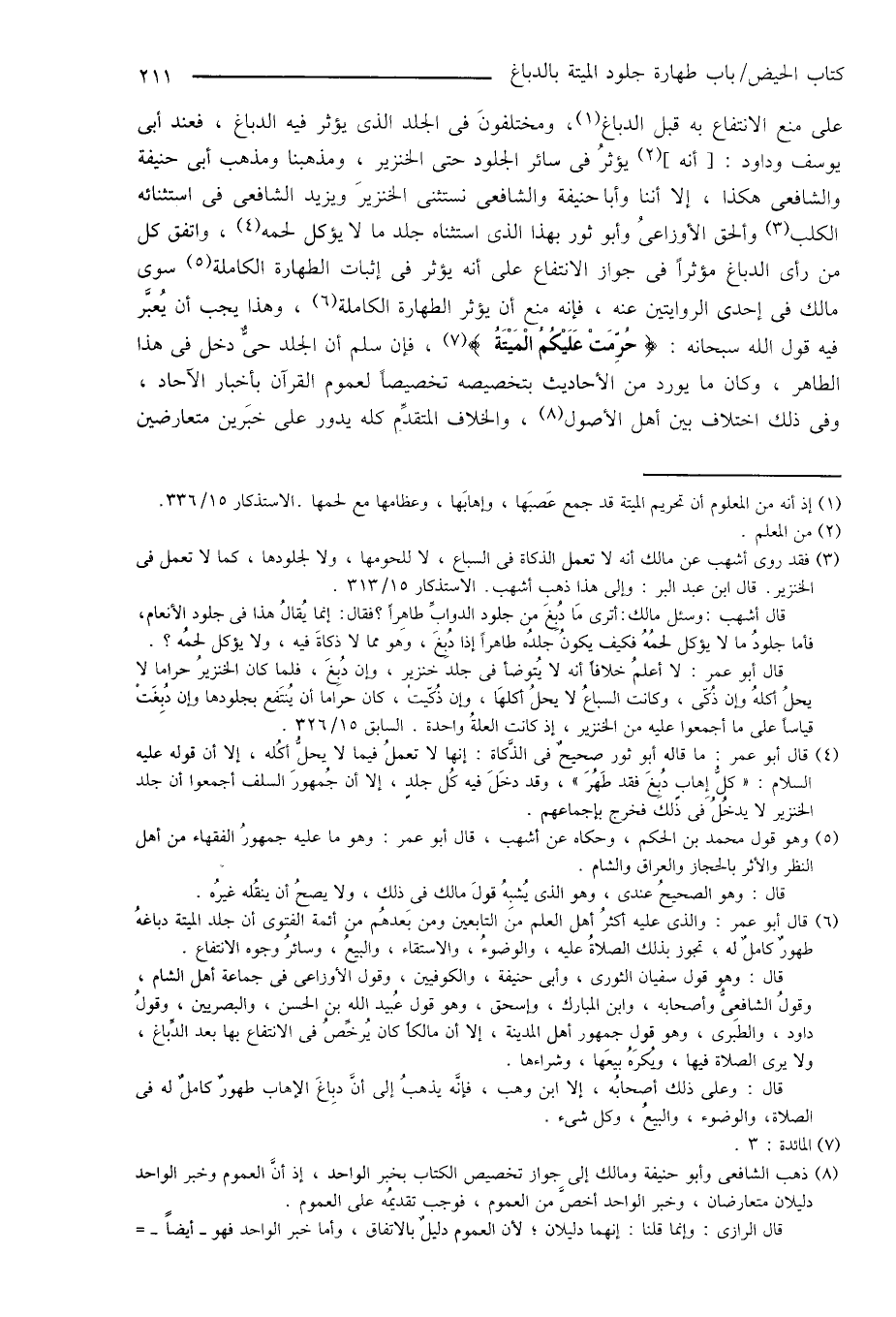 قال أبو عمر: لا أعلمُ خلافاً أنه لا يُتوضأ فى جلد خنزير، وإن دُبِغَ، فلما كان الخنزيرُ حراماً لا يحلُ أكلهُ وإن ذُكّى، وكانت السباعُ لا يحلُ أكلهَا، وإن ذُكّيتْ، كان حراماً أن يُنتَفع بجلودها وإن دُبِغَتْ قياساً على ما أجمعوا عليه من الخنزير، إذ كانت العلةُ واحدة. السابق 15/ 326.
