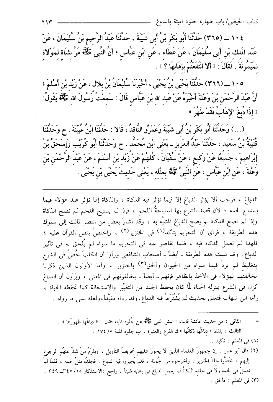 (¬2) قال أبو عمر: إن جمهورَ العلماء الذين لا يجوز عليهم تحريفُ التأويل، ويلزَمُ منْ شذَّ عنهُم الرجوع إليهم، خَصَّوا جِلدَ الخنزير، وأخرجوه من الجُملة، فلم يُجيزوا فيه الدباغ. فجلدُه مثلُ لحمِه، فلمَّا لم تعملَ فى لحمه ولا فى جلدِه الذكاةُ لم يعمل الدباغَ فى إهابه شيئاً. راجع: الاستذكار 15/ 347 - 349.