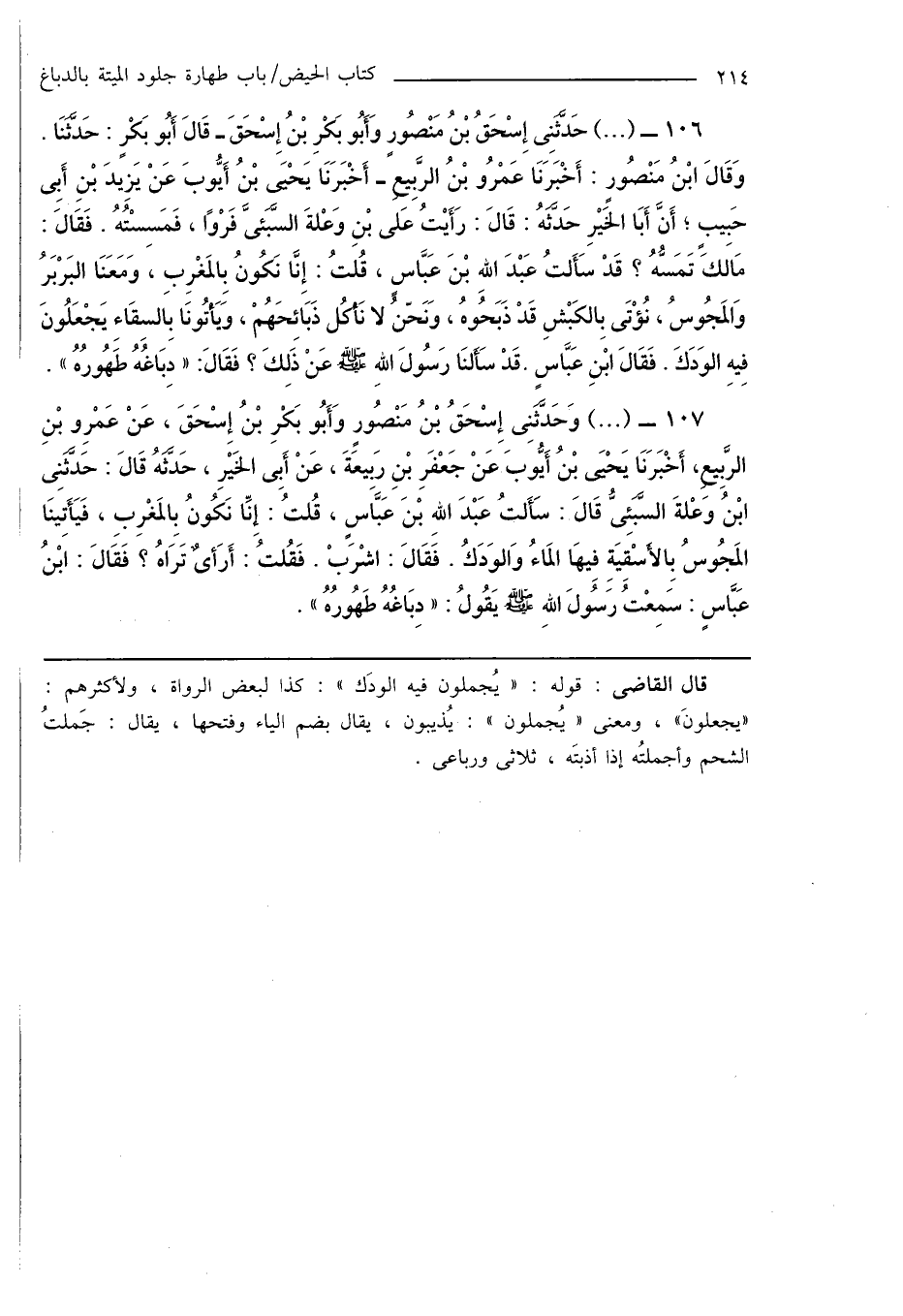 107 - (...) وَحَدَّثَنِى إِسْحَاقُ بْنُ مَنْصُورٍ وَأَبُو بَكْرِ بْنُ إِسْحَاقَ، عَنْ عَمْرِو بْنِ الرَّبِيعِ، أَخْبَرَنَا يَحْيَى بْنُ أَيُّوبَ عَنْ جَعْفَرِ بْنِ رَبِيعَةَ، عَنْ أَبِى الخَيْرِ، حَدَّثَهُ قَالَ: حَدَّثَنِى ابْنُ وعْلةَ السَّبَئِىُّ قَالَ: سَأَلتُ عَبْدَ اللهِ بْنَ عَبَّاسٍ، قُلْتُ: إِنِّا نَكُونُ بِالمَغْرِبِ، فَيَأَتِينَا المَجُوسُ بِالأَسْقِيَةِ فِيهَا المَاءُ وَالوَدَكُ. فَقَالَ: اشْرَبْ. فَقُلْتُ: أَرَأىٌ تَرَاهُ؟ فَقَالَ: ابْنُ عَبَّاسٍ: سَمِعْتُ رَسُولَ اللهِ صَلَّى اللهُ عَلَيْهِ وَسَلَّمَ يَقُولُ: " دِبَاغُهُ طَهُورُهُ ".