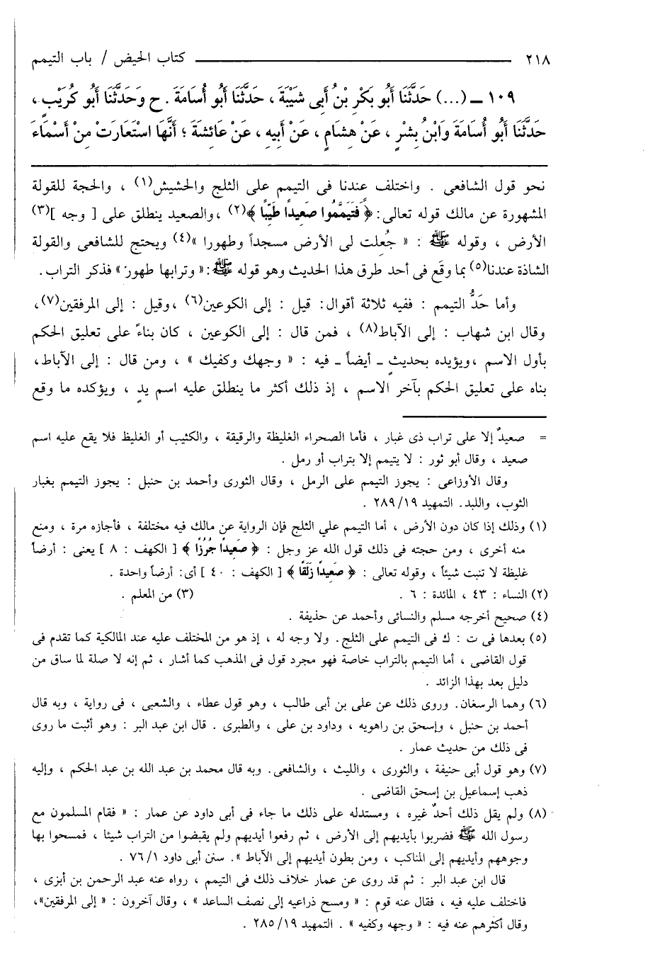 (¬5) بعدها فى ت: ك فى التيمم على الثلج. ولا وجه له، إذ هو من المختلف عليه عند المالكية كما تقدم فى قول القاضى، أما التيمم بالتراب خاصة فهو مجرد قول فى المذهب كما أشار، ثم إنه لا صلة لما ساق من دليل بعد بهذا الزائد.