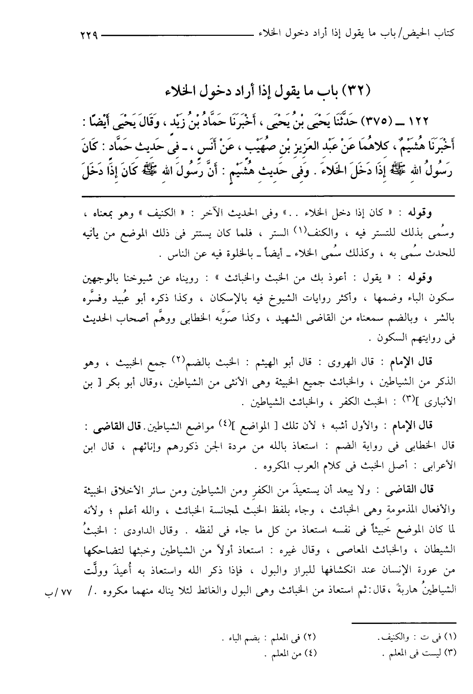 122 - (375) حَدَّثَنَا يَحْيَى بْنُ يَحْيَى، أَخْبَرَنَا حَمَّادُ بْنُ زَيْدٍ، وَقَالَ يَحْيَى ايْضًا: أَخْبَرَنَا هُشَيْمٌ، كِلاهُمَا عَنْ عَبْدِ العَزِيزِ بْنِ صُهَيْبٍ، عَنْ أَنَسٍ، - فِى حَدِيثِ حَمَّادٍ: كَانَ رَسُولُ اللهِ صَلَّى اللهُ عَلَيْهِ وَسَلَّمَ إِذَا دَخَلَ الخَلاءَ. وَفِى حَدِيثِ هُشَيْمٍ: أَنَّ رَسُولَ اللهِ صَلَّى اللهُ عَلَيْهِ وَسَلَّمَ كَانَ إِذَا دَخَلَ