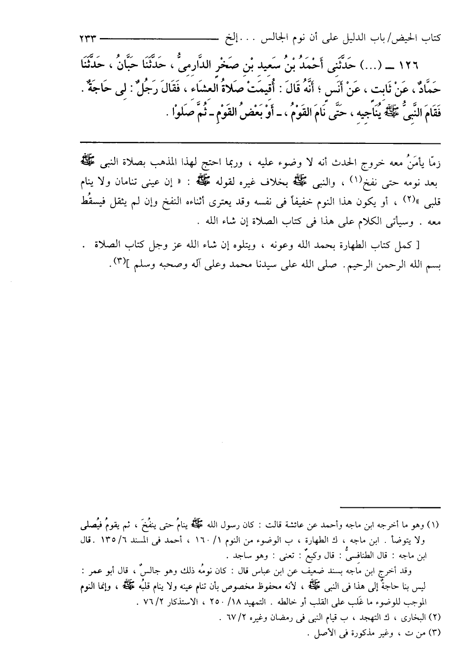 (¬1) وهو ما أخرجه ابن ماجه وأحمد عن عائشة قالت: كان رسول الله صَلَّى اللهُ عَلَيْهِ وَسَلَّمَ ينامُ حتى ينفُخَ، ثم يقومُ فيُصلى ولا يتوضأ. ابن ماجه، ك الطهارة، ب الوضوء من النوم 1/ 160، أحمد فى المسند 6/ 135. قال ابن ماجه: قال الطنافِسىُّ: قال وكيعٌ: تعنىْ وهو ساجد.