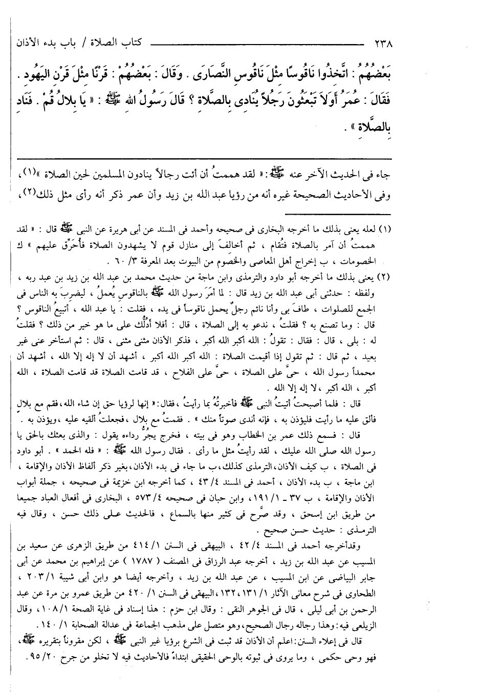 (¬2) يعنى بذلك ما أخرجه أبو داود والترمذى وابن ماجة من حديث محمد بن عبد الله بن زيد بن عبد ربه، ولفظه: حدثنى أبى عبد الله بن زيد قال: لما أَمَرَ رسول الله صَلَّى اللهُ عَلَيْهِ وَسَلَّمَ بالناقوسِ يُعملُ، ليضرِبَ به الناس فى الجمع للصلوات، طافَ بى وأنا نائم رجلٌ يحمل ناقوساً فى يده، فقلت: يا عبد الله، أتبيعُ الناقوس؟ قال: وما تصنع به؟ فقلتُ، ندعو به إلى الصلاة، قال: أفلا أَدُلُّك على ما هو خير من ذلك؟ فقلتُ له: بلى، قال: فقال: تقولُ: الله أكبر الله أكبر، فذكر الأذان مثنى مثنى، قال: ثم استأخر عنى غير بعيد، ثم قال: ثم تقول إذا أقيمت الصلاة: الله أكبر الله أكبر، أشهد أن لا إله إِلا الله، أشهد أن محمداً رسول الله، حىَّ على الصلاة، حىَّ على الفلاح، قد قامت الصلاة قد قامت الصلاة، الله أكبر، الله أكبر، لا إله إِلا الله.