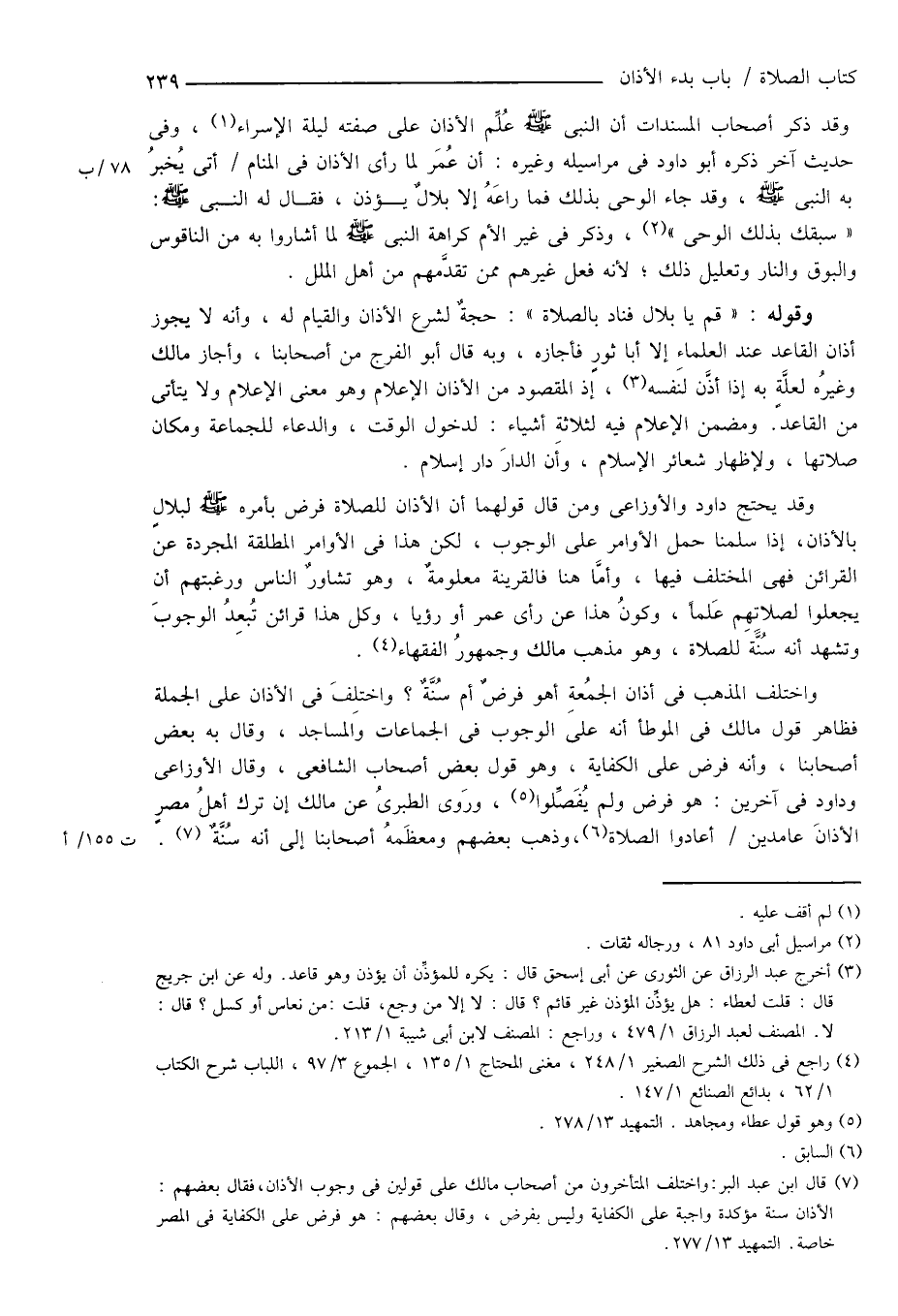 (¬7) قال ابن عبد البر: واختلف المتأخرون من أصحاب مالك على قولين فى وجوب الأذان، فقال بعضهم: الأذان سنة مؤكدة واجبة على الكفاية وليس بفرض، وقال بعضهم: هو فرض على الكفاية فى المصر خاصة. التمهيد 13/ 277.