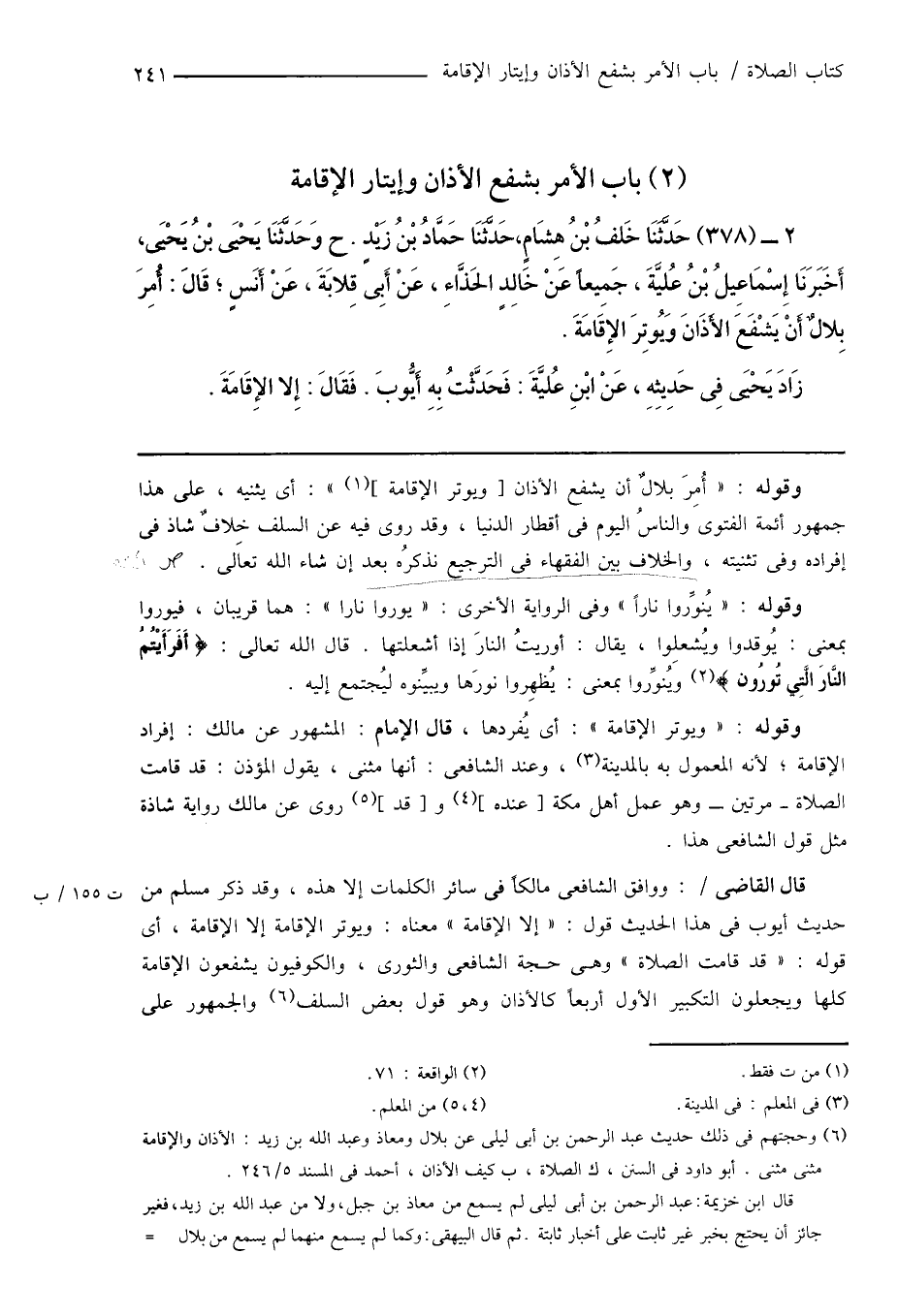 قال القاضى: ووافق الشافعى مالكاً فى سائر الكلمات إِلا هذه، وقد ذكر مسلم من حديث أيوب فى هذا الحديث قول: " إِلا الإقامة " معناه: ويوتر الإقامة إِلا الإقامة، أى قوله: " قد قامت الصلاة " وهى حجة الشافعى والثورى، والكوفيون يشفعون الإقامة كلها ويجعلون التكبير الأول أربعاً كالأذان وهو قول بعض السلف (¬6) والجمهور على