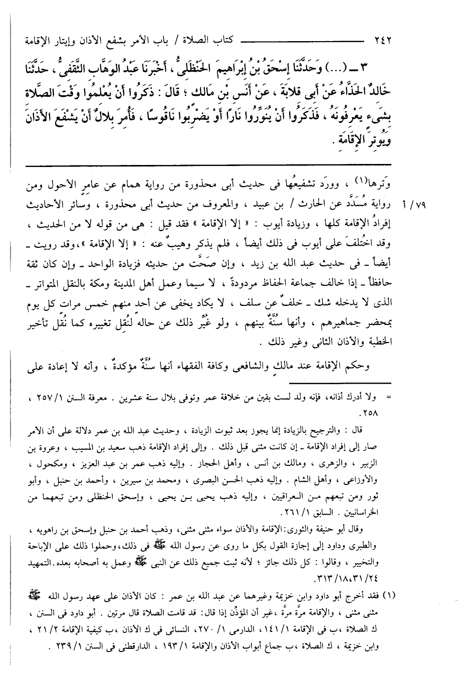 قال: والترجيح بالزيادة إنما يجوز بعد ثبوت الزيادة، وحديث عبد الله بن عمر دلالة على أن الأمر صار إلى إفراد الإقامة - إن كانت مثنى قبل ذلك. وإلى إفراد الإقامة ذهب سعيد بن المسيب، وعروة بن الزبير، والزهرى، ومالك بن أنس، وأهل الحجاز. وإليه ذهب عمر بن عبد العزيز، ومكحول، والأوزاعى، وأهل الشام. وإليه ذهب الحسن البصرى، ومحمد بن سيرين، وأحمد بن حنبل، وأبو ثور ومن تبعهم من العراقيين، وإليه ذهب يحيى بن يحيى، وإسحاق الحنظلى ومن تبعهما من الخراسانيين. السابق 1/ 261.