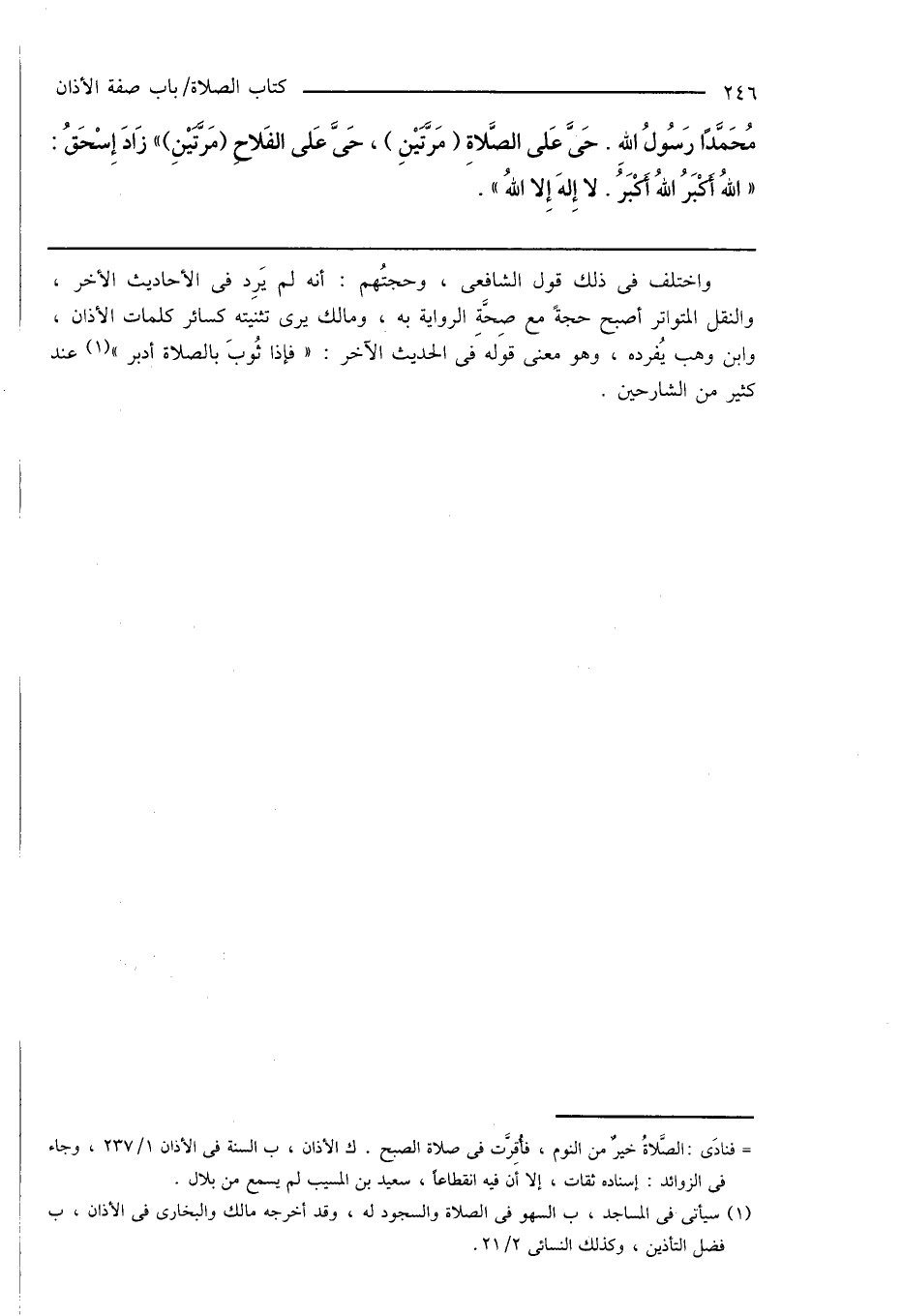 = فنادَى: الصَّلاةُ خيرٌ من النوم، فأُقِرَّت فى صلاة الصبح. ك الأذان، ب السنة فى الأذان 1/ 237، وجاء فى الزوائد: إسناده ثقات، إِلا أن فيه انقطاعاً، سعيد بن المسيب لم يسمع من بلال.