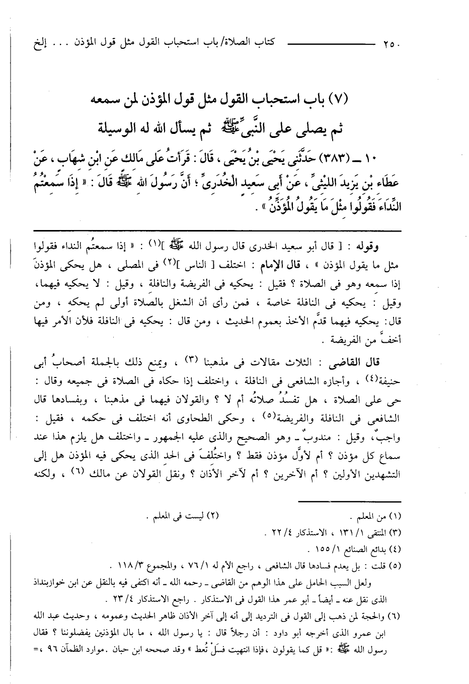 (7) باب استحباب القول مثل قول المؤذن لمن سمعه ثم يصلى على النَّبِىِّ صَلَّى اللهُ عَلَيْهِ وَسَلَّمَ ثم يسأل الله له الوسيلة