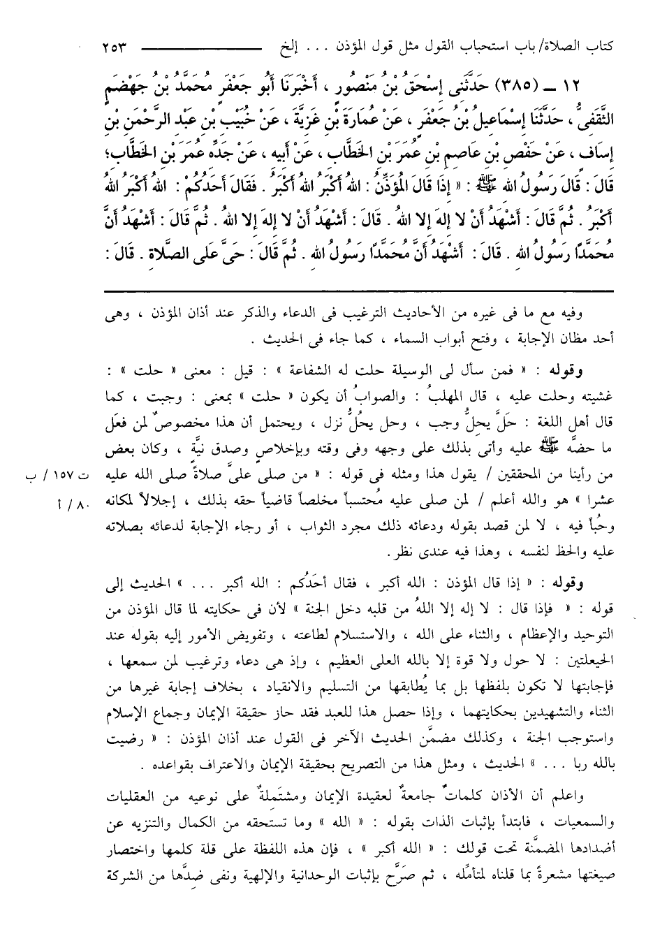 12 - (385) حَدَّثَنِى إِسْحَاقُ بْنُ مَنْصُورٍ، أَخْبَرَنَا أَبُو جَعْفَرٍ مُحَمَّدُ بْنُ جَهْضَمٍ الثَّقَفِىُّ، حَدَّثَنَا إِسْمَاعِيلُ بْنُ جَعْفَرٍ، عَنْ عُمَارَةَ بْنِ غَزِيَّةَ، عَنْ خُبَيْبِ بْنِ عَبْدِ الرَّحْمَنِ بْنِ إِسَافٍ، عَنْ حَفْصِ بْنِ عَاصِمِ بْنِ عُمَرَ بْنِ الخَطَّابِ، عَنْ أَبِيهِ، عَنْ جَدِّهِ عُمَرَ بْنِ الخَطَّابِ؛ قَالَ: قَالَ رَسُولُ اللهِ صَلَّى اللهُ عَلَيْهِ وَسَلَّمَ: " إِذَا قَالَ المُؤَذِّنُ: اللهُ أَكْبَرُ اللهُ أَكْبَرُ. فَقَالَ أَحَدُكُمْ: اللهُ أَكْبَرُ اللهُ أَكْبَرُ. ثُمَّ قَالَ: أَشْهَدُ أَنْ لا إِلهَ إِلا اللهُ. قَالَ: أَشْهَدُ أَنْ لا إِلهَ إِلا اللهُ. ثُمَّ قَالَ: أَشْهَدُ أَنَّ مُحَمَّدًا رَسُولُ اللهِ. قَالَ: أَشْهَدُ أَنَ مُحَمَّدًا رَسُولُ اللهِ. ثُمَّ قَالَ: حَىَّ عَلى الصَّلاةِ. قَالَ: