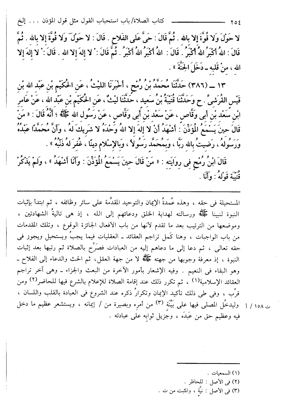 13 - (386) حَدَّثَنَا مُحَمَّدُ بْنُ رمحٍ، أَخْبَرَنَا الليْثُ، عَنِ الحُكَيْمِ بْنِ عَبْدِ اللهِ بْنِ قَيْسٍ القُرَشِىِّ. ح وَحَدَّثَنَا قُتَيْبَةُ بْنُ سَعِيدٍ، حَدَّثَنَا ليْثٌ، عَنِ الحُكَيْمِ بْنِ عَبْدِ اللهِ، عَنْ عَامِرِ ابْنِ سَعْدِ بْنِ أَبِى وَقَّاصٍ، عَنْ سَعْدِ بْنِ أَبِى وَقَّاصٍ، عَنْ رَسُولِ اللهِ صَلَّى اللهُ عَلَيْهِ وَسَلَّمَ؛ أَنَّهُ قَالَ: " مَنْ قَالَ حِينَ يَسْمَعُ المُؤَذِّنَ: أَشْهَدُ أَنْ لا إِلهَ إِلا اللهُ وَحْدَهُ لا شَرِيكَ لهُ، وَأَنَّ مُحَمَّدًا عَبْدُهُ وَرَسُوَلهُ، رَضِيتُ بِاللهِ رَبًّا، وَبِمُحَمَّدٍ رَسُولاً، وَبِالإِسْلامِ دِينًا، غُفِرَ لهُ ذْنبُهُ ".