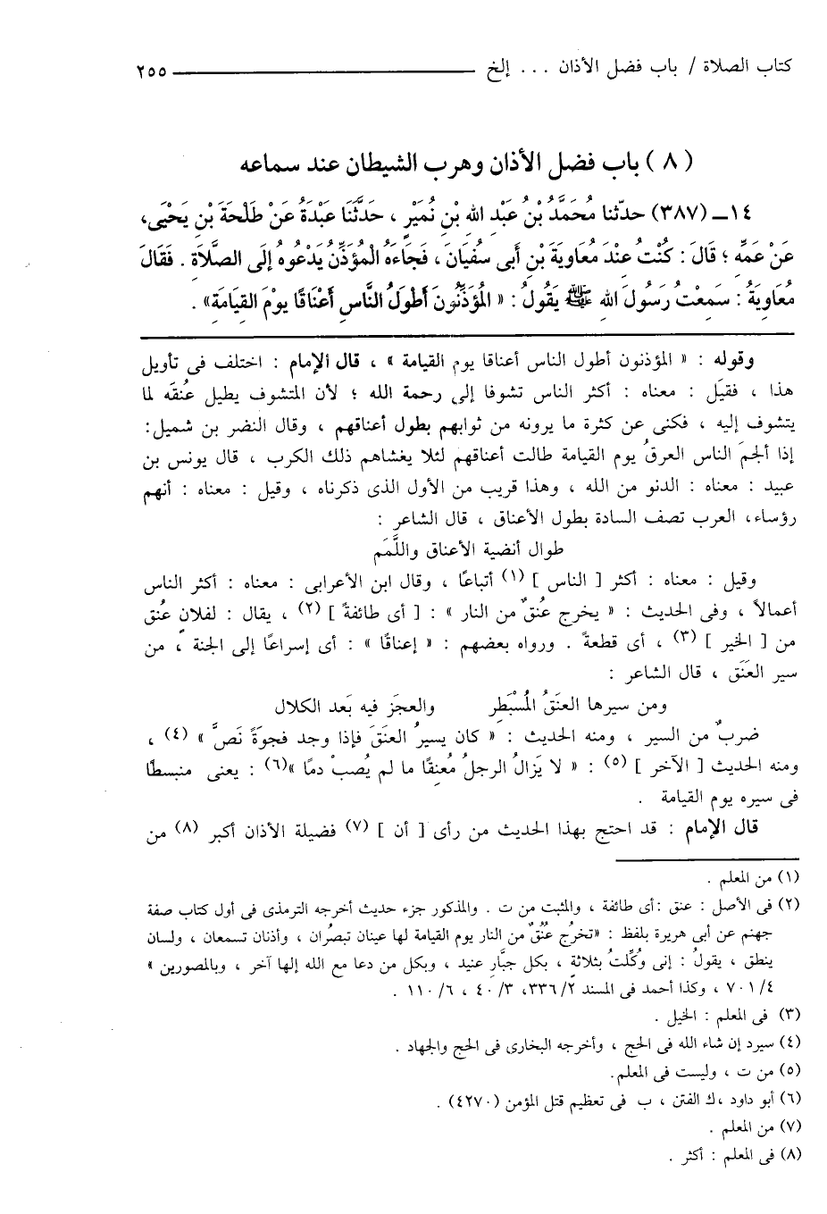 14 - (387) حدّثنا مُحَمَّدُ بْنُ عَبْدِ اللهِ بْنِ نُمَيْرٍ، حَدَّثَنَا عَبْدَةُ عَنْ طَلْحَةَ بْنِ يَحْيَى، عَنْ عَمِّهِ؛ قَالَ: كُنْتُ عِنْدَ مُعَاوِيَةَ بْنِ أَبِى سُفيَانَ، فَجَاءَهُ الْمُؤَذِّنُ يَدْعُوهُ إِلَى الصَّلَاةِ. فَقَالَ مُعَاوِيَةُ: سَمِعْتُ رَسُول اللهِ صَلَّى اللهُ عَلَيْهِ وَسَلَّمَ يَقُولُ: " المُؤَذِّنُونَ أَطْوَلُ النَّاسِ أَعْنَاقًا يوْمَ القِيَامَةِ ".