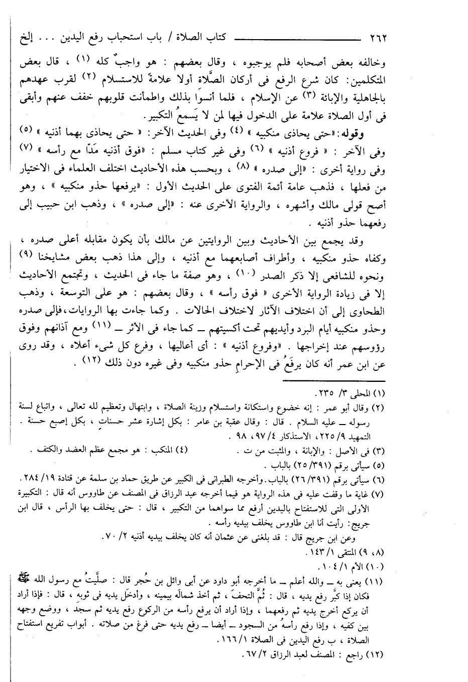 (¬11) يعنى به - والله أعلم - ما أخرجه أبو داود عن أبى وائل بن حُجر قال: صلَّيتُ مع رسول الله صَلَّى اللهُ عَلَيْهِ وَسَلَّمَ فكان إذا كبَّر رفع يديه، قال: ثُمَّ التحفَ، ثم أخذ شمالَه بيمينه، وأدخَل يديه فى ثوبهِ، قال: فإذا أراد أن يركع أخرج يديه ثم رفعهما، وإذا أراد أن يرفع رأسه من الركوع رفع يديه ثم سجد، ووضع وجهه بين كفيه، وإذا رفع رأسهُ من السجود - أيضًا - رفع يديه حتى فرغ من صلاته. أبواب تفريع استفتاح الصلاة، ب رفع اليدين فى الصلاة 1/ 166.