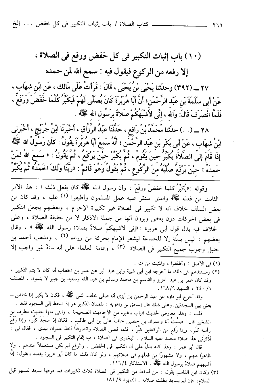 قال أبو عمر. وهذا كله يدلَّ على أن التكبير فى الخفض. والرفع لم يكن مستعملاً عندهم، ولا ظاهرًا فيهم، ولا مشهورًا من فعلهم فى صلاتهم، ولو كان ذلك ما كان أبو هريرة يفعله ويقول: إنَّه أشبههم صلاةً برسولِ الله صَلَّى اللهُ عَلَيْهِ وَسَلَّمَ. الاستذكار 4/ 116.
