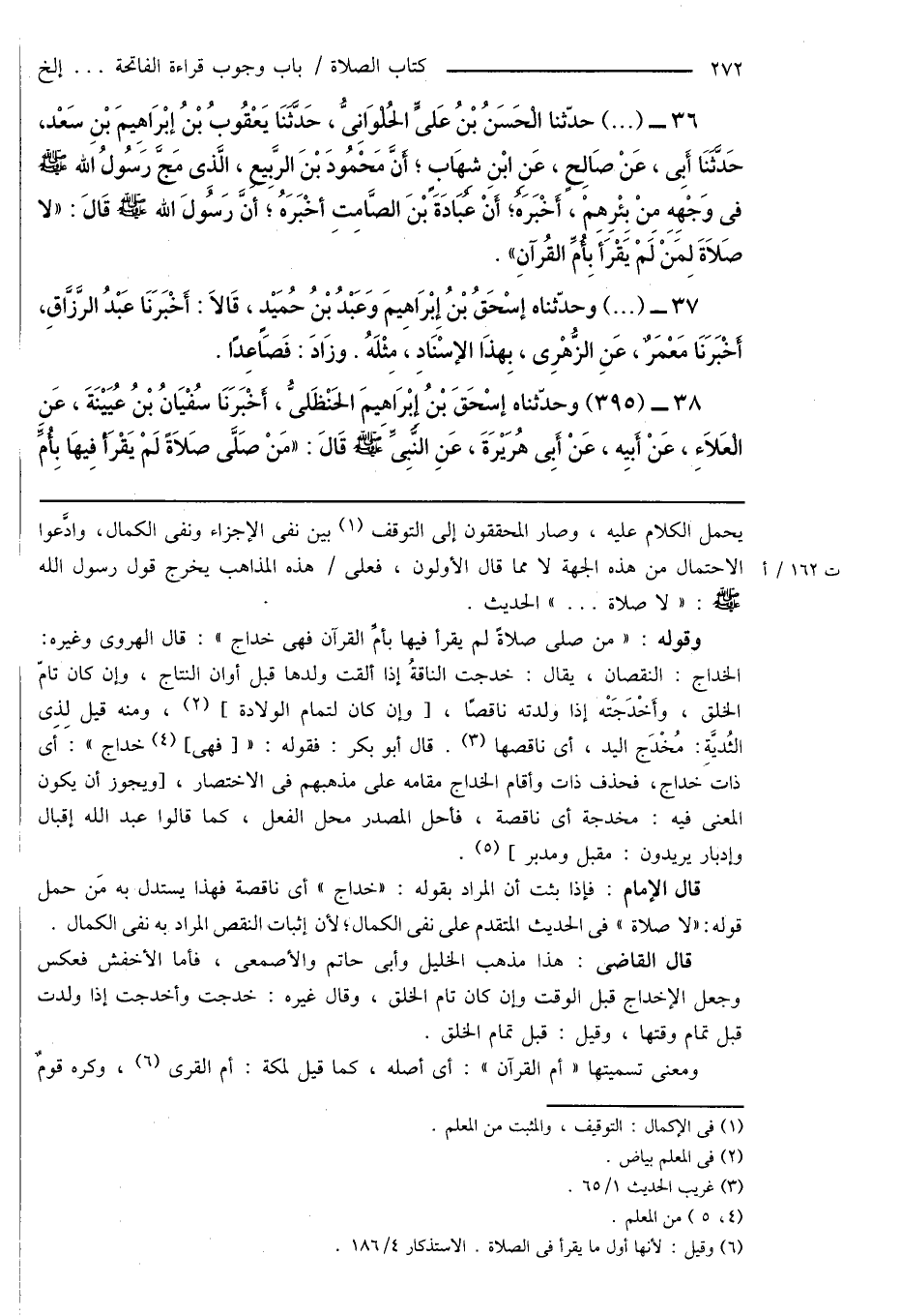 قال الإمام: فإذا بثت أن المراد بقوله: " خداج " أى ناقصة فهذا يستدل به مَن حمل قوله: " لا صلاة " فى الحديث المتقدم على نفى الكمال؛ لأن إثبات النقص المراد به نفى الكمال.