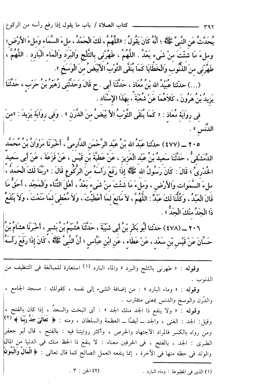 205 - (477) حدّثنا عَبْدُ اللهِ بْنُ عَبْدِ الرَّحْمَنِ الدَّارِمِىُّ، أَخْبَرَنَا مَرَوَانُ بْنُ مُحَمَّدٍ الدِّمَشْقِىُّ، حَدَّثَنَا سَعِيدُ بْنُ عَبْدِ الْعَزِيزِ، عَنْ عَطِيَّةَ بْنِ قَيْسٍ، عَنْ قَزَعَةَ، عَنْ أَبِى سَعِيدٍ الخُدْرِىِّ؛ قَالَ: كَانَ رَسُولُ اللهِ صَلَّى اللهُ عَلَيْهِ وَسَلَّمَ إِذَا رَفَعَ رَأسَهُ مِنَ الرُّكُوعِ، قَالَ: " رَبَّنَا لَكَ الْحَمْدُ، مِلءَ السَّمَاواتِ وَالأَرْضِ، وَمِلءَ مَا شئِتَ مِنْ شَىءٍ بَعْدُ، أَهْلَ الثَّنَاءِ وَالْمَجْدِ، أَحَقُّ مَا قَالَ الْعَبْدُ، وَكُلَّنَا لَكَ عَبْدٌ: اللَّهُمَّ، لَا مَانِعَ لِمَا أَعْطَيْتَ، وَلَا مُعْطِىَ لِمَا مَنَعْتَ، وَلَا يَنْفَعُ ذَا الْجَدِّ مِنْكَ الْجَدُّ ".