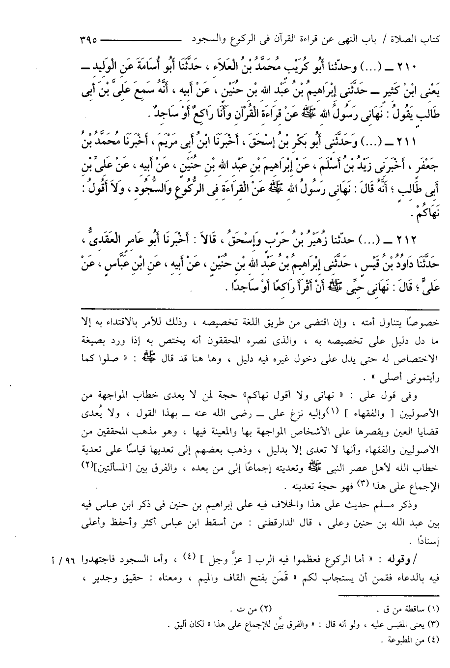 210 - (...) وحدّثنا أَبُو كُرَيْبٍ مُحَمَّدُ بْنُ الْعَلَاءِ، حَدَّثَنَا أَبُو أُسَامَةَ عَنِ الْوَلِيدِ - يَعْنِى ابْنْ كَثِيرٍ - حَدَّثَنِى إِبْرَاهِيمُ بْنُ عَبْدِ اللهِ بْنِ حُنَيْنٍ، عَنْ أَبِيهِ، أَنَّهُ سَمِعَ عَلِىَّ بْنَ أَبِى طَالبٍ يَقُولُ: نَهَانِى رَسُولُ اللهِ صَلَّى اللهُ عَلَيْهِ وَسَلَّمَ عَنْ قِرَاءَةِ الْقُرْآنِ وَأَنَا رَاكِعٌ أَوْ سَاجِدٌ.
