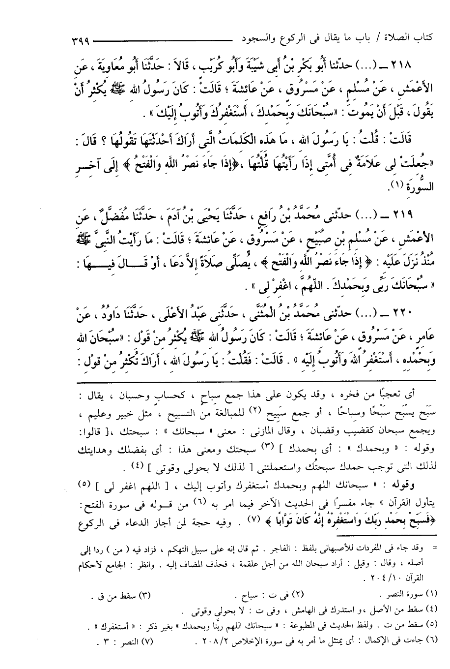 219 - (...) حدّثنى مُحَمَّدُ بْنُ رَافِعٍ، حَدَّثَنَا يَحْيَى بْنُ آدَمَ، حَدَّثَنَا مُفَضَّلٌ، عَنِ الأَعْمَشِ، عَنْ مُسْلِمِ بْنِ صُبَيْحٍ، عَنْ مَسْرُوقٍ، عَنْ عَائِشَةَ؛ قَالَتْ: مَا رَأَيْتُ النَّبِىَّ صَلَّى اللهُ عَلَيْهِ وَسَلَّمَ مُنْذُ نَزَلَ عَلَيْهِ: {إِذَا جَاءَ نَصْرُ اللَّهِ وَالْفَتْح}، يُصَلِّى صَلَاةً إِلَّا دَعَا، أَوْ قَالَ فِيهَا: " سُبْحَانَكَ رَبِّى وَبِحَمْدِكَ. اللَّهُمَّ، اغْفِرْ لِى ".