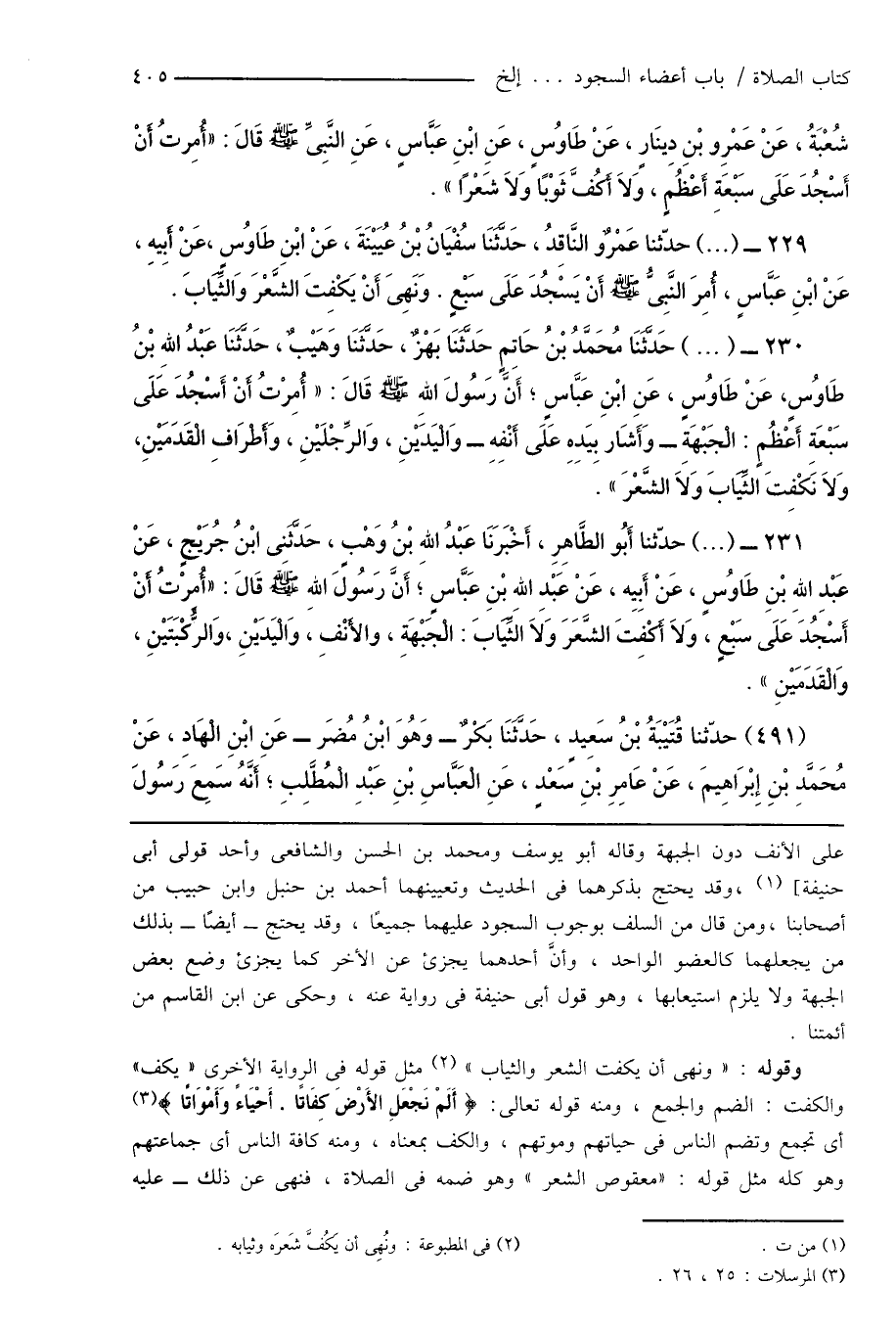 229 - (...) حدّثنا عَمْرٌو النَّاقِدُ، حَدَّثَنَا سُفْيَانُ بْنُ عُيَيْنَةَ، عَنْ ابْنِ طَاوُسٍ، عَنْ أَبِيهِ، عَنْ ابْنِ عَبَّاسٍ، أُمِرَ النَّبِىُّ صَلَّى اللهُ عَلَيْهِ وَسَلَّمَ أَنْ يَسْجُدَ عَلَى سَبْعٍ. وَنَهِىَ أَنْ يَكْفِتَ الشَّعْرَ وَالثِّيَابَ.