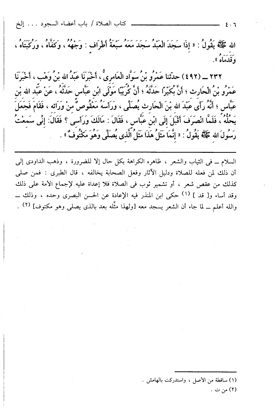 232 - (492) حدّثنا عَمْرُو بْنُ سَوَّادٍ الْعَامِرِىُّ، أَخْبَرَنَا عَبْدُ اللهِ بْنُ وَهْبٍ، أَخْبَرَنَا عَمْرُو بْنُ الْحَارِثِ؛ أَنَّ بُكَيْرًا حَدَّثَهُ؛ أَنَّ كُرَيْبًا مَوْلَى ابْنِ عَبَّاسٍ حَدَّثَهُ، عَنْ عَبْدِ اللهِ بْنِ عَبَّاسٍ؛ أَنَّهُ رَأَى عَبْدَ اللهِ بْنَ الْحَارِثِ يُصَلِّى، وَرَأسَهُ مَعْقُوصٌ مِنْ وَرَائِهِ، فَقَامَ فَجَعَلَ يَحُلُّهُ، فَلَمَّا انْصَرَفَ أَقْبَلَ إِلَى ابْنِ عَبَّاسٍ، فَقَالَ: مَالَكَ وَرَأسِى؟ فَقَالَ: إِنِّى سَمِعْتُ رَسُولَ اللهِ صَلَّى اللهُ عَلَيْهِ وَسَلَّمَ يَقُولُ: " إِنَّمَا مَثَلُ هَذَا مَثَلُ الَّذِى يُصَلِّى وَهُوَ مَكْتُوفٌ ".
