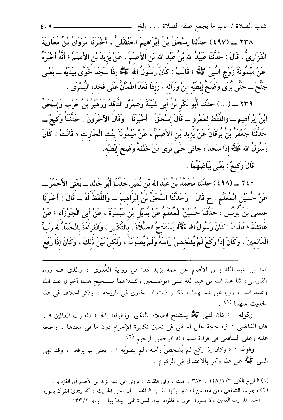 240 - (498) حدّثنا مُحَمَّدُ بْنُ عَبْدِ اللهِ بْنِ نُمَيْرٍ، حَدَّثَنَا أَبُو خَالِدٍ - يَعْنِى الأَحْمَرَ - عَنْ حُسَيْنٍ الْمُعَلِّمِ. ح قَالَ: وَحَدَّثَنَا إِسْحَاقُ بْنُ إِبْرَاهِيمَ - وَاللَّفْظُ لَهُ - قَالَ: أَخْبَرَنَا عِيسَى بْنُ يُونُسَ، حَدَّثَنَا حُسَيْنٌ الْمُعَلِّمُ عَنْ بُدَيْلِ بْنِ مَيْسَرَةَ، عَنْ أَبِى الْجَوْزَاءِ؛ عَنْ عَائِشَةَ؛ قَالَتْ: كَانَ رَسُولُ اللهِ صَلَّى اللهُ عَلَيْهِ وَسَلَّمَ يَسْتَفْتِحُ الصَّلَاةَ، بِالتَّكْبِيرِ، وَالْقِرَاءَةَ بِالْحَمْدُ للهِ رَبِّ الْعَالِمِينَ، وَكَانَ إِذَا رَكَعَ لَمْ يُشْخِصْ رَأْسَهُ وَلَمْ يُصَوِّبْهُ، وَلَكِنْ بَيْنَ ذَلِكَ، وَكَانَ إِذَا رَفَعَ