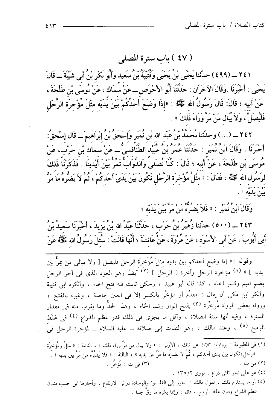 (¬1) فى المطبوعة: بروايات ثلاث غير تلك، الأولى: " ولا يبال من مَرَّ وراء ذلك "، الثانية: " مثلُ ومُؤخِرَة الرّحل، تكون بين يدى أحَدِكم، ثُمَّ لا يَضرُّه ما مَرَّ بين يديه "، الثالثة: " فلا يَضُرَّه من مَرَّ بين يديه ".