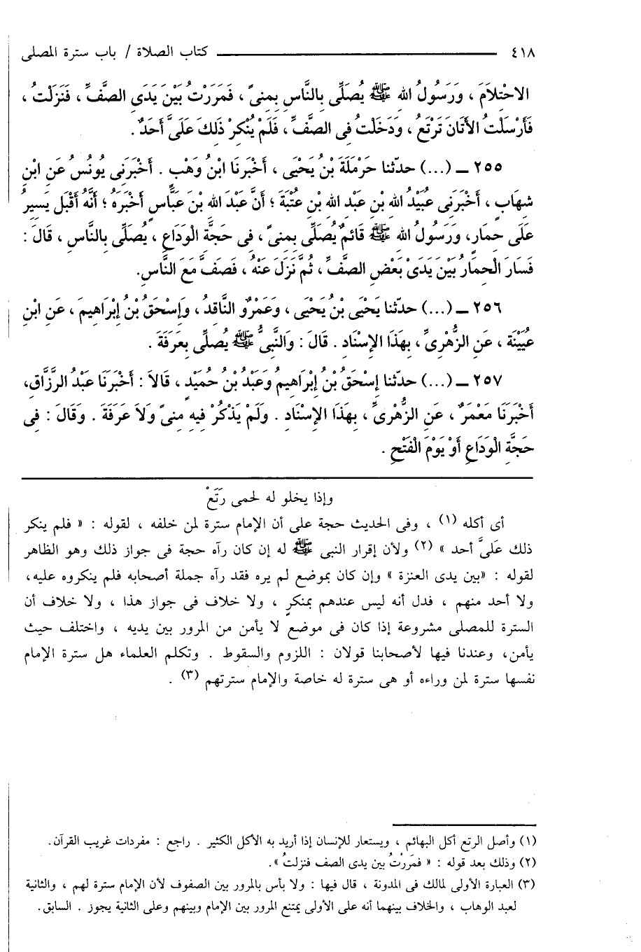 255 - (...) حدّثنا حَرْمَلَةَ بْنُ يَحْيَى، أَخْبَرنَا ابْنُ وَهْبٍ. أَخْبَرَنِى يُونُسُ عَنِ ابْنِ شِهَابٍ، أَخْبَرَنِى عُبَيْدُ اللهِ بْنِ عَبْدِ اللهِ بْنِ عُتْبَةَ؛ أَنَّ عَبْدَ اللهِ بْنَ عَبَّاسٍ أَخْبَرَهُ؛ أَنَّهُ أَقْبَل يَسِيِرُ عَلَى حِمَارٍ، وَرَسُولُ اللهِ صَلَّى اللهُ عَلَيْهِ وَسَلَّمَ قَائمٌ يُصَلِّى بِمِنًى، فِى حَجَّةِ الْوَدَاعِ، يُصَلِّى بِالنَّاسِ، قَالَ: فَسَارَ الْحِمَارُ بَيْنَ يَدَىْ بَعْضِ الصَّفِّ، ثُمَّ نَزَلَ عَنْهُ، فَصَفَّ مَعَ النَّاسِ.