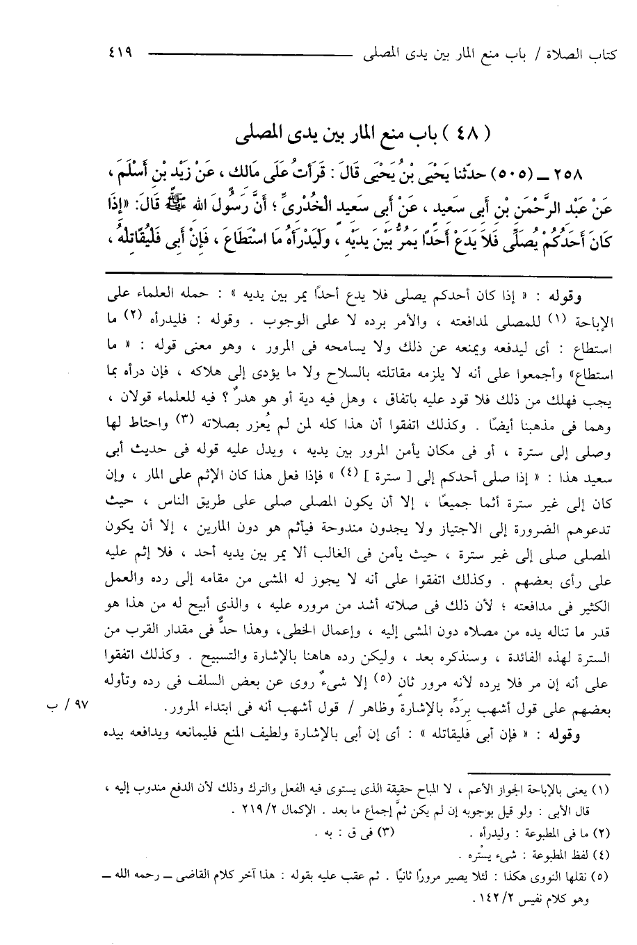 258 - (505) حدّثنا يَحْيَى بْنُ يَحْيَى قَالَ: قَرَأْتُ عَلَى مَالِكٍ، عَنْ زَيْد بْنِ أَسْلَمَ، عَنْ عَبْدِ الرَّحْمَنِ بْنِ أَبِى سَعِيدٍ، عَنْ أَبِى سَعِيدٍ الْخُدْرِىِّ؛ أَنَّ رَسُولَ اللهِ صَلَّى اللهُ عَلَيْهِ وَسَلَّمَ قَالَ: " إِذَا كَانَ أَحَدُكُمْ يُصَلِّى فَلَا يَدَعْ أَحَدًا يَمُرُّ بَيْنَ يَدَيْهِ، وَلْيَدْرَأهُ مَا اسْتَطَاعَ، فَإِنْ أَبى فَلْيُقَاتِلْهُ،