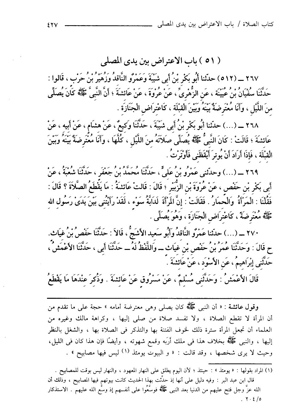 267 - (512) حدّثنا أَبُو بَكْرِ بْنُ أَبِى شَيْبَةَ وَعَمْرٌو النَّاقِدُ وَزُهَيْرُ بْنُ حَرْبٍ، قَالوا: حَدَّثَنَا سُفْيَانُ بْنُ عُيَيْنَة، عَنِ الزُّهْرِىِّ، عَنْ عُرْوَةَ، عَنْ عَائِشَةَ؛ أَن النَّبِىَّ صَلَّى اللهُ عَلَيْهِ وَسَلَّمَ كَانَ يُصَلِّى مِنَ اللَّيْلِ، وَأَنَا مُعْتَرِضَةٌ بَيْنَهُ وَبَيْنَ الْقِبْلَةِ، كَاعْتِرَاضِ الْجَنَازَةِ.