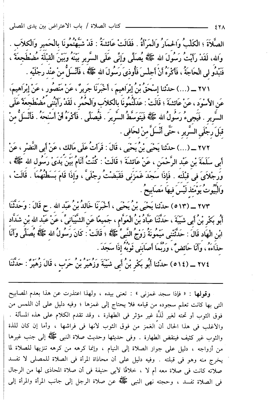 271 - (...) حدّثنا إِسْحَاقُ بْنُ إِبْرَاهِيمَ، أَخْبَرَنَا جَرِيرٌ، عَنْ مَنْصُورٍ، عَنْ إِبْرَاهِيمَ، عَنِ الأَسْوَدِ، عَنْ عَائِشَةَ؛ قَالَتْ: عَدَلْتُمُونَا بِالْكِلَابِ وَالْحُمُرِ، لَقَدْ رَأَيْتُنِى مُضْطَجِعَةً عَلَى السَّرِيرِ. فَيَجِىءُ رَسُولُ اللهِ صَلَّى اللهُ عَلَيْهِ وَسَلَّمَ فَيَتَوَسَّطُ السَّرِيرَ. فَيُصَلِّى. فَأَكْرَهُ أَنْ أَسْنِحَهُ. فَأَنْسَلُّ مِنْ قِبَلَ رِجْلَىِ السَّرِيرِ، حَتَّى أَنْسَلَّ مِنْ لِحَافِى.
